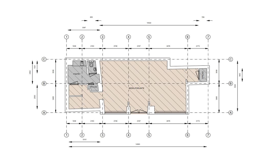 Ca. 65 m² vvo commerciële ruimte op de begane grond, inclusief magazijn aan de rechter- en linkerzijde.