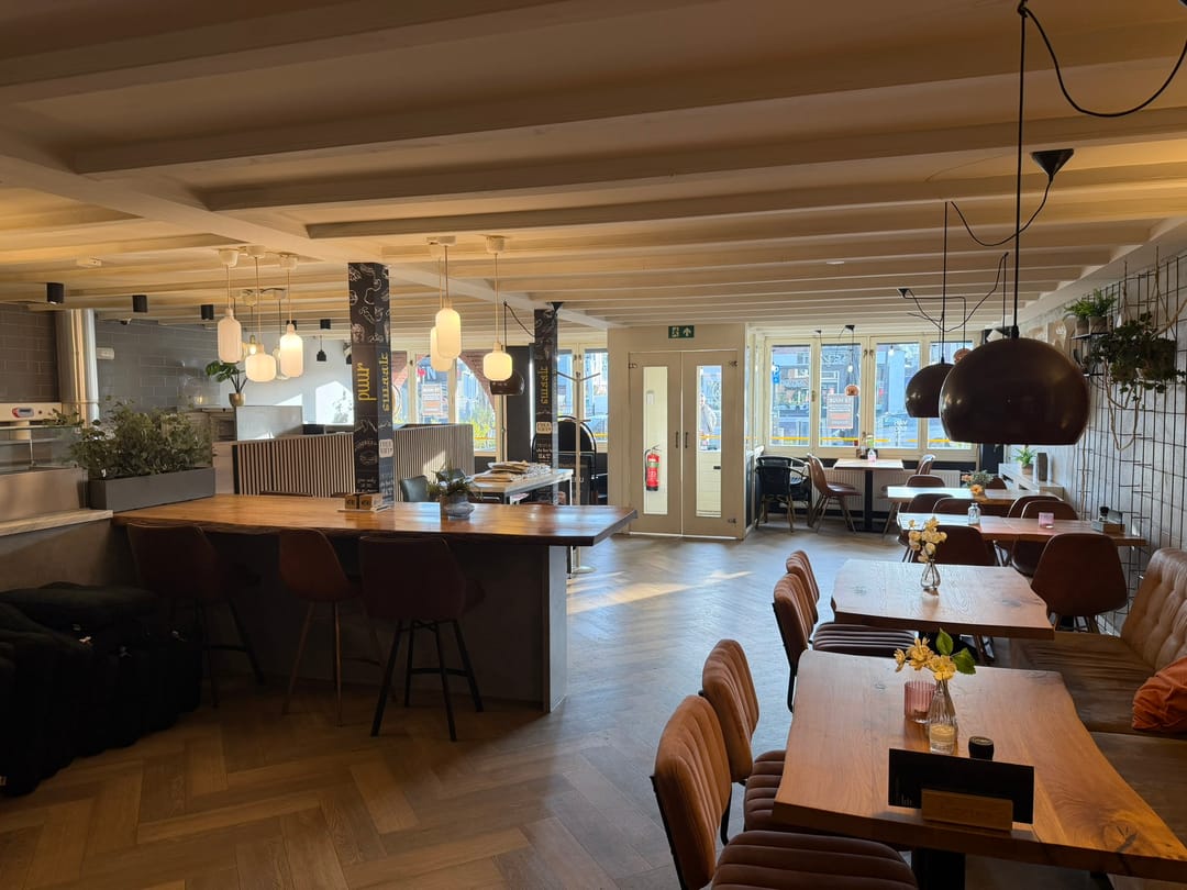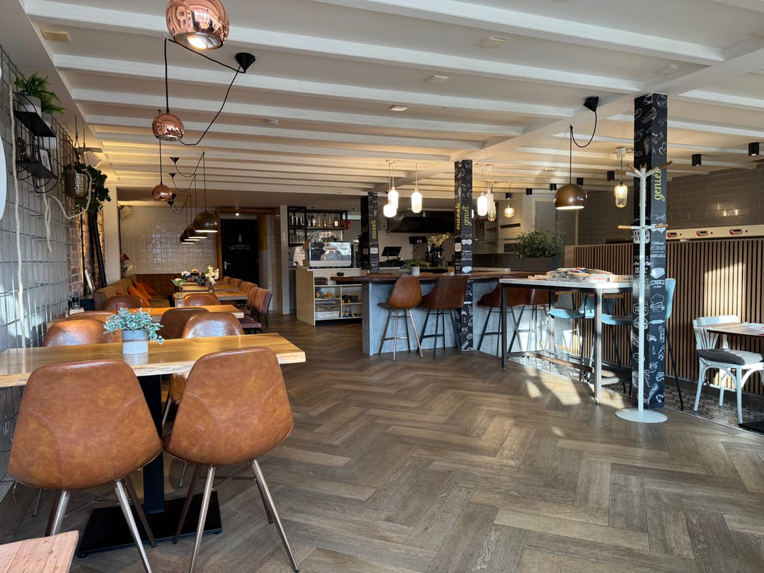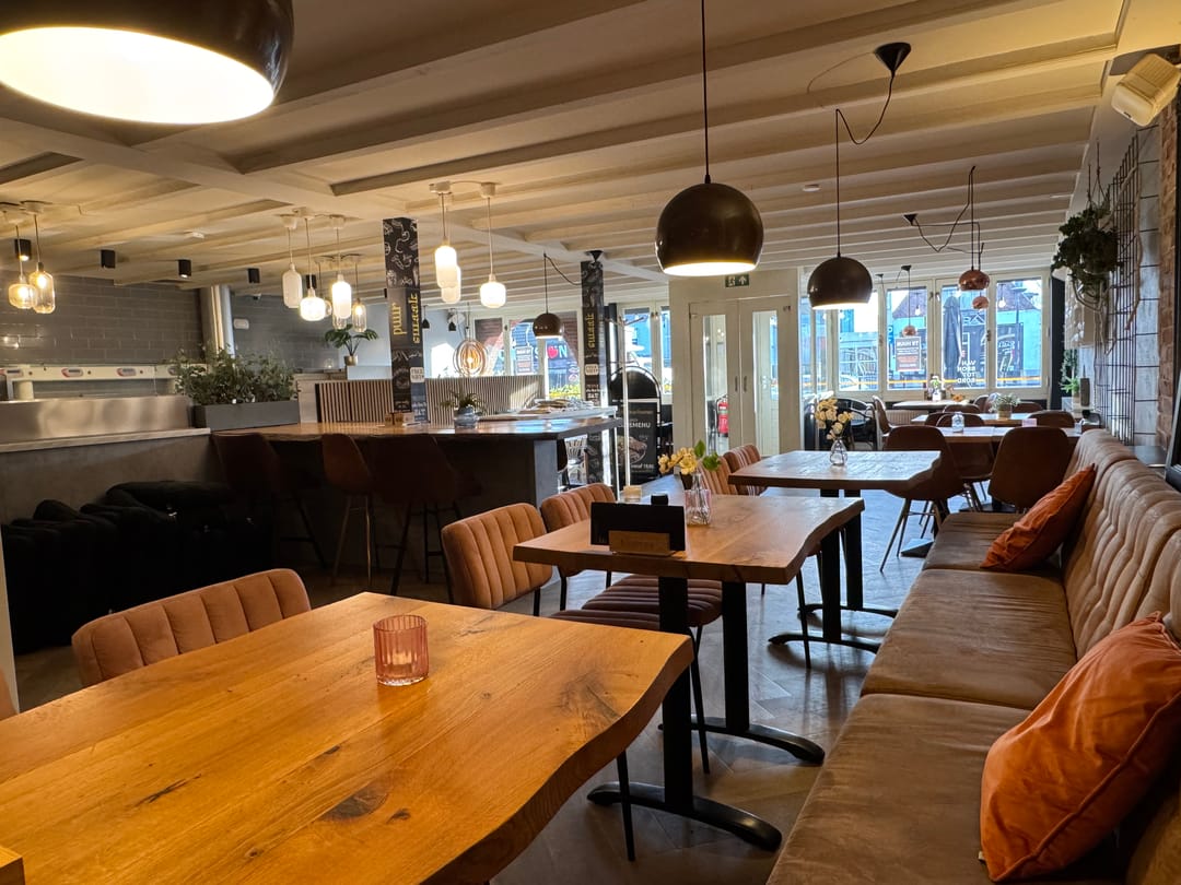 Het eetcafé biedt plaats aan 52 gasten en op het terras aan de voorzijde geeft plek voor 60 gasten. Het terras is gunstig gelegen en in de zomer is deze plek autovrij. Deze locatie is een geweldige plek op het drukste punt van de Kaden en bevindt zich tussen alle populaire zaken.