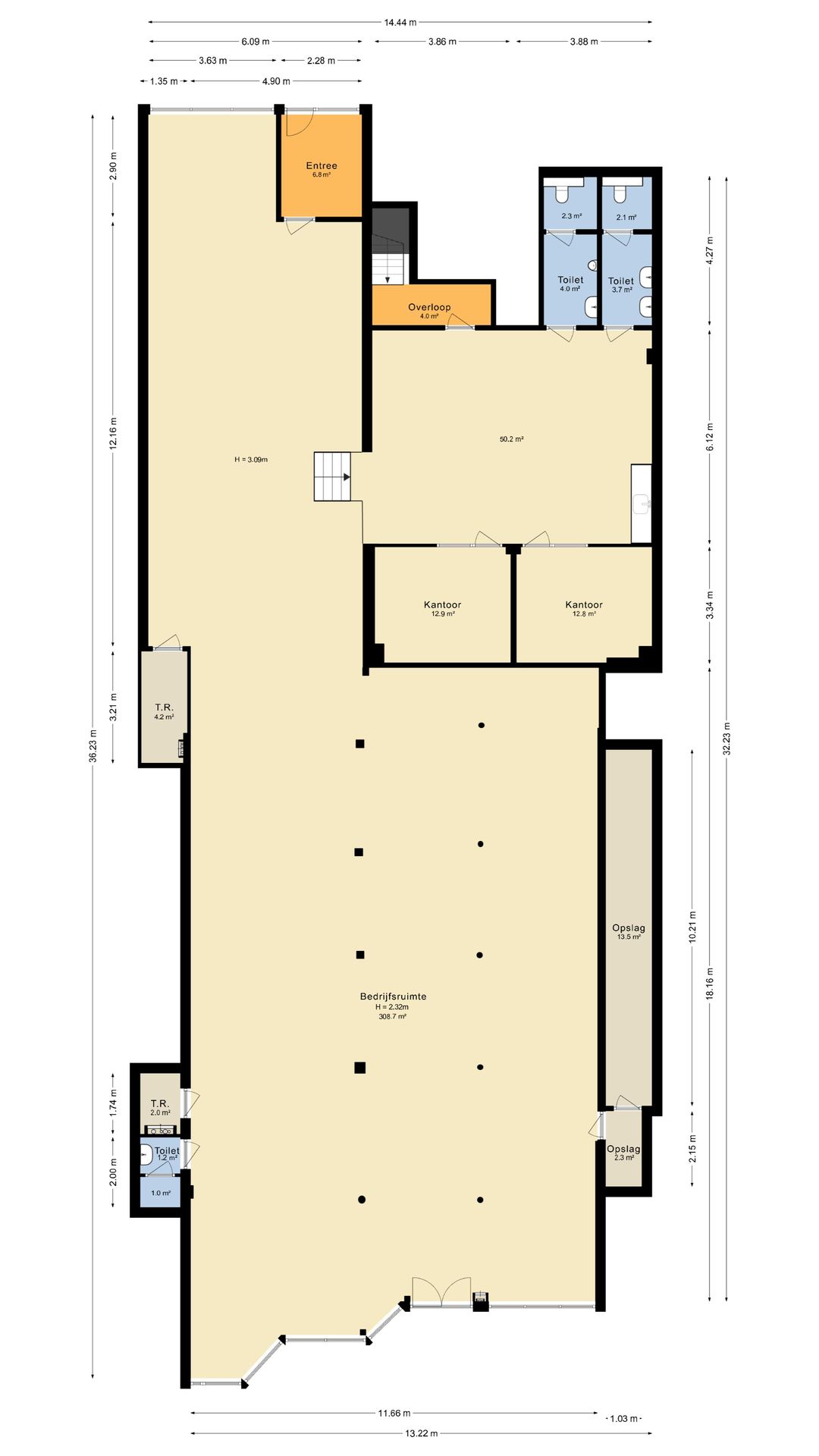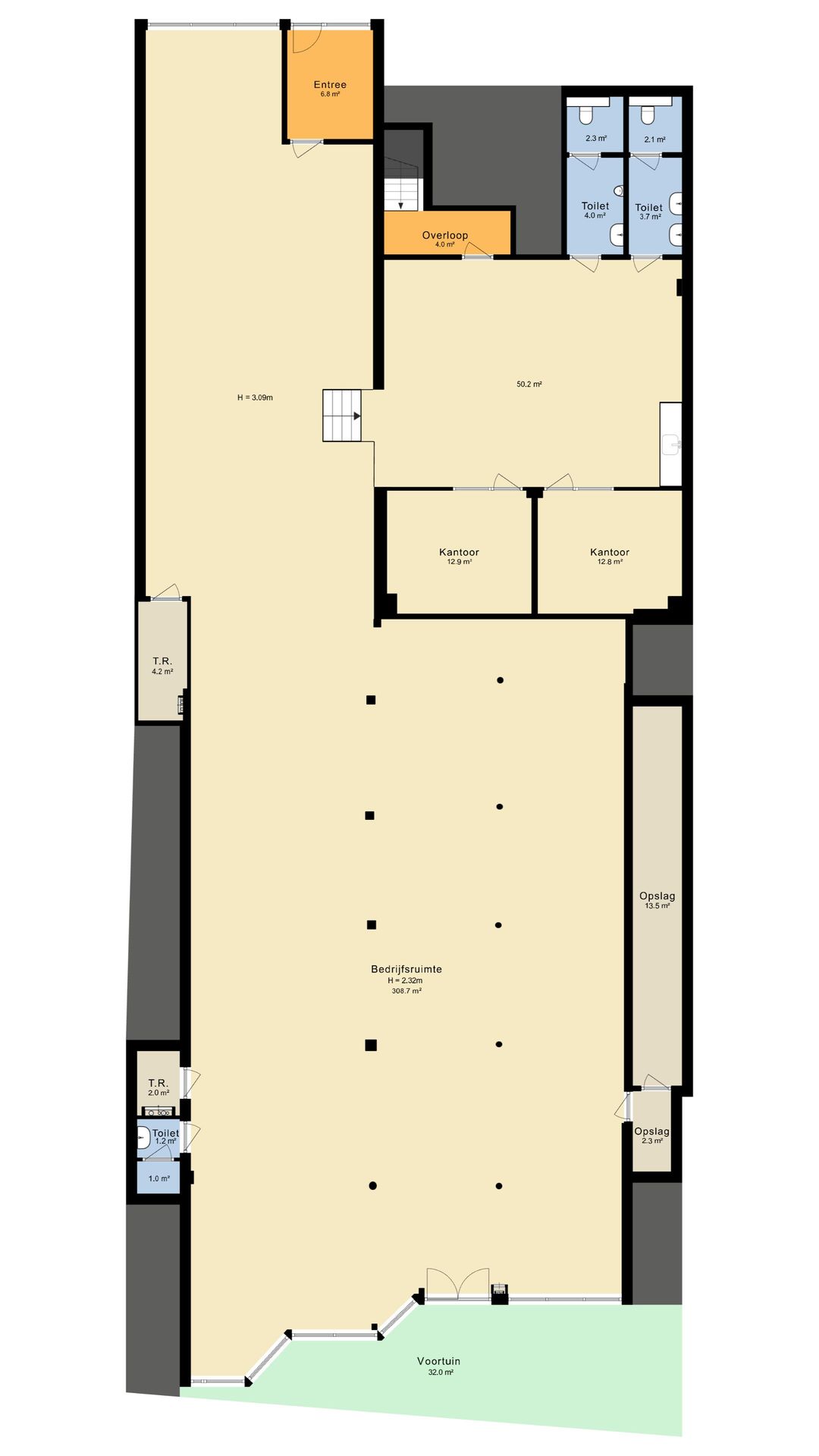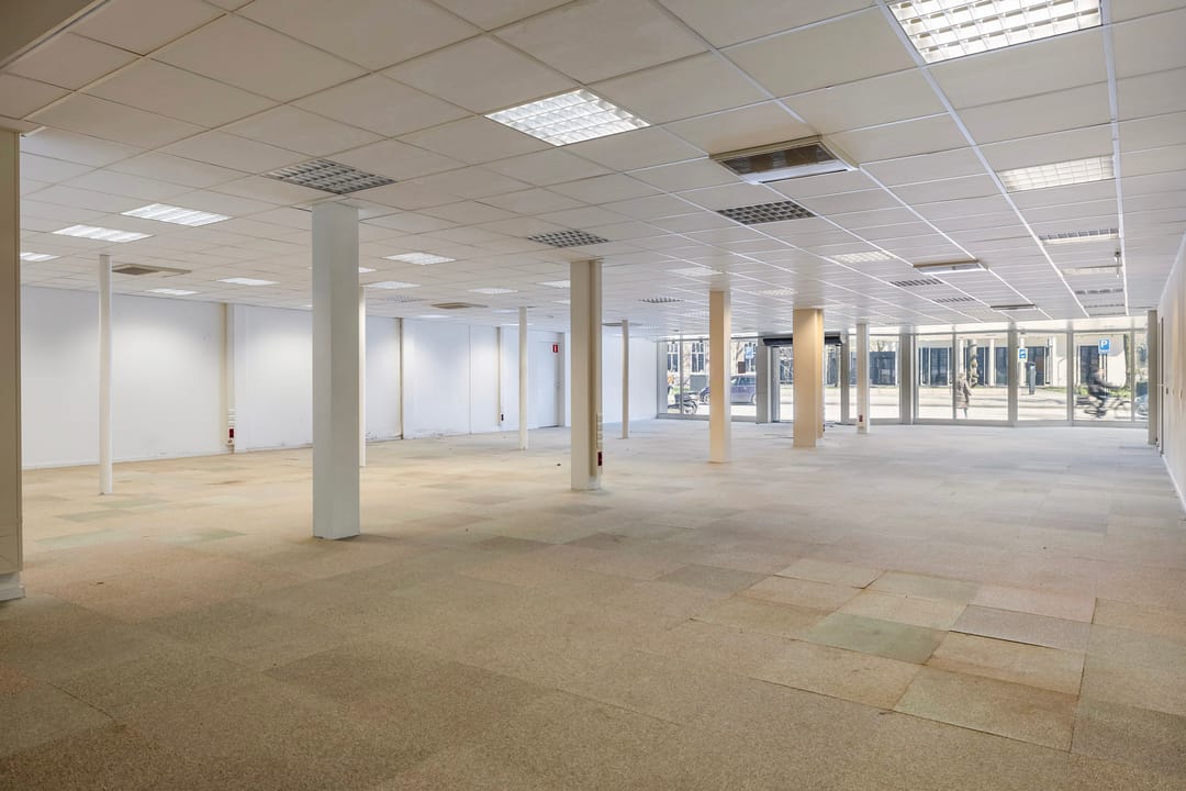 Achter de speelse pui over de volle breedte (ca. 15 meter) een overzichtelijke ruimte van ca. 35 meter diep. Totaal metrage begane grond 428 m² VVO.
