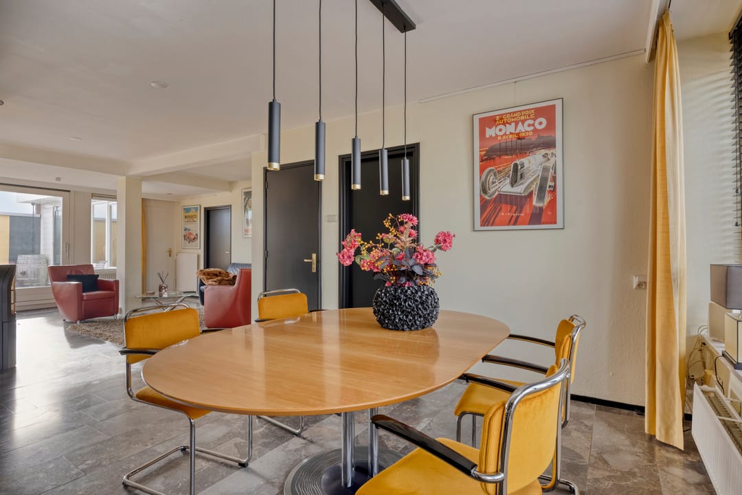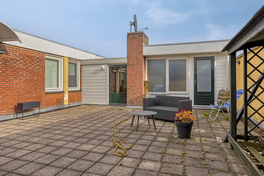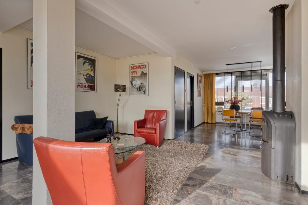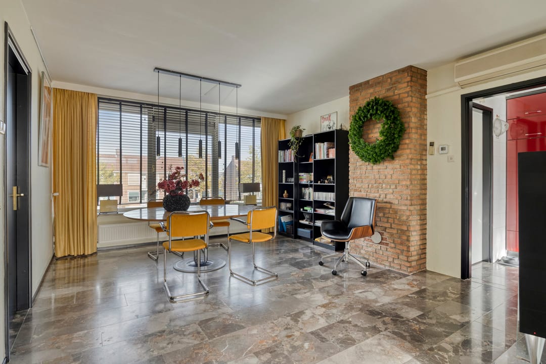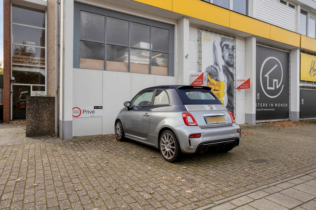 Op de verdieping bevinden zich 2 verhuurde bovenwoningen met gezamenlijke opgang en ruim dakterras met bergruimte. Het gebouw is in 1964 gebouwd en meerdere keren verbouwd. Aan de voor- en achterzijde is ruimte voor parkeren of buitenopslag.
