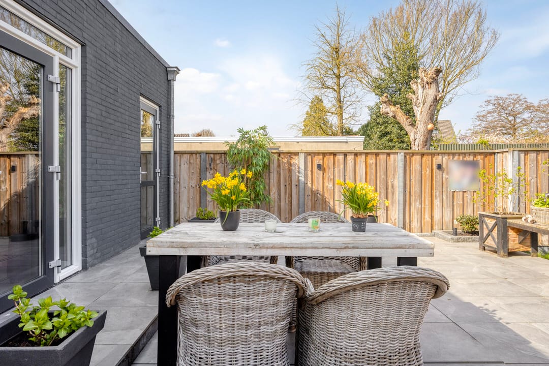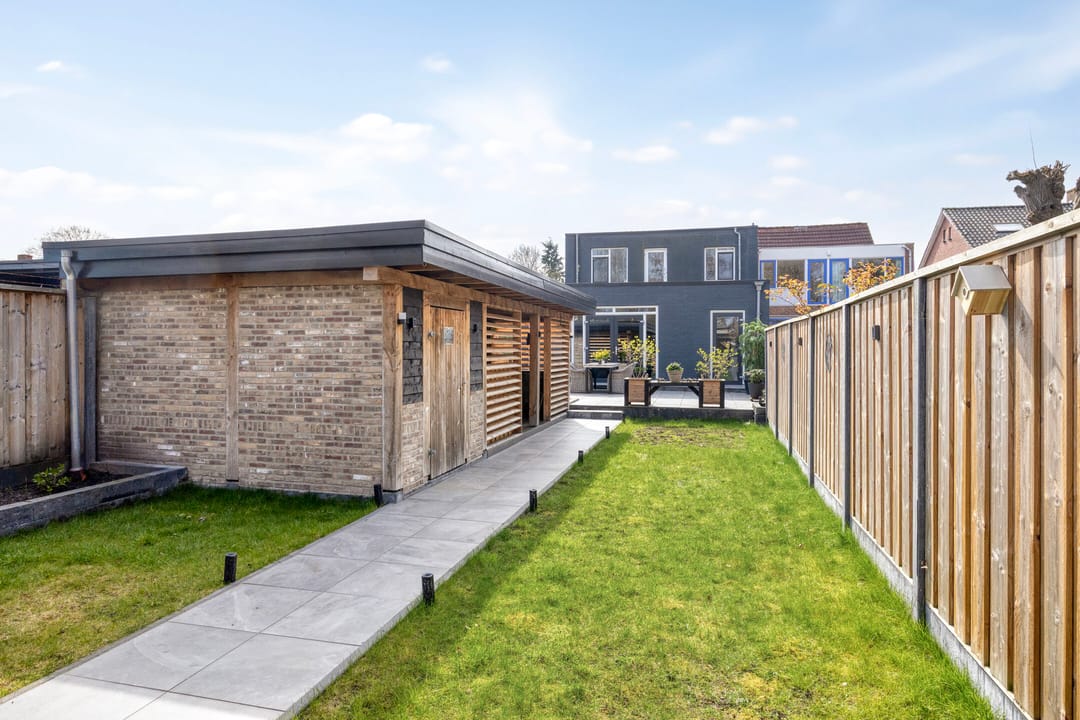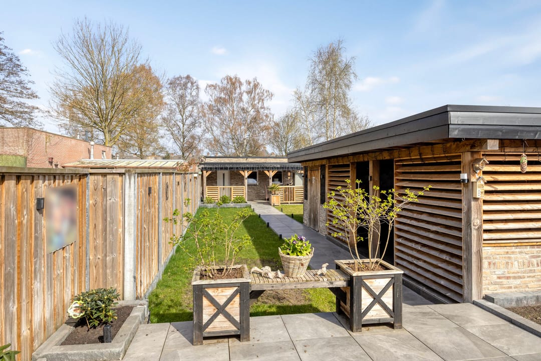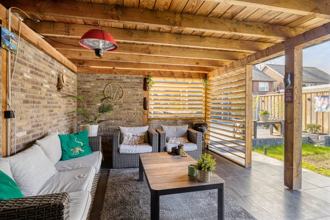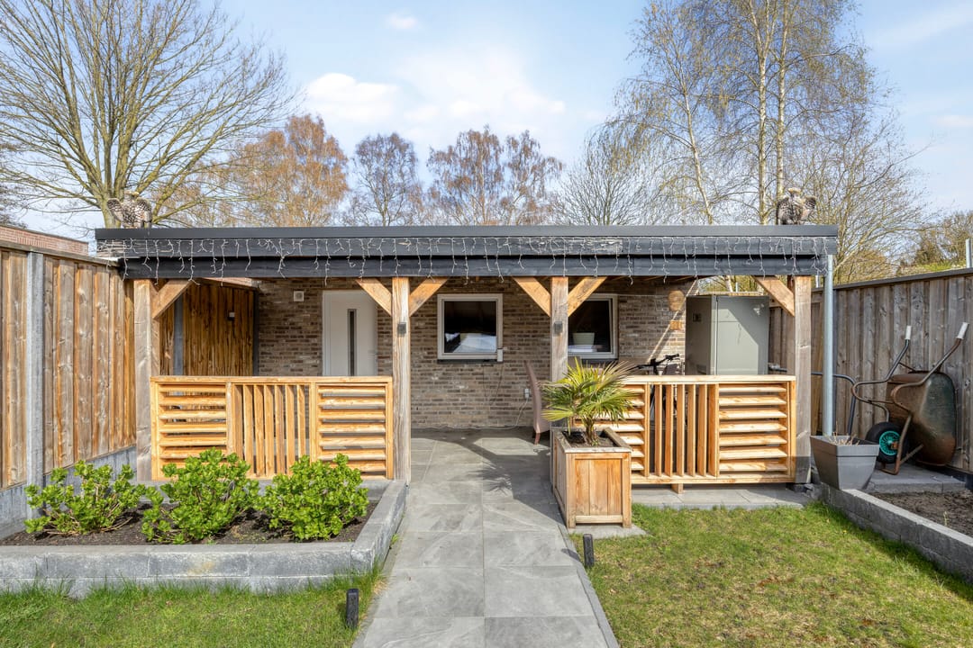 De diepe achtertuin biedt een aantrekkelijke buitenruimte en is voorzien van een luxe overkapping en een zelfstandig gastenverblijf met eigen keuken en badkamer, wat extra gebruiks- of verhuurmogelijkheden biedt.
