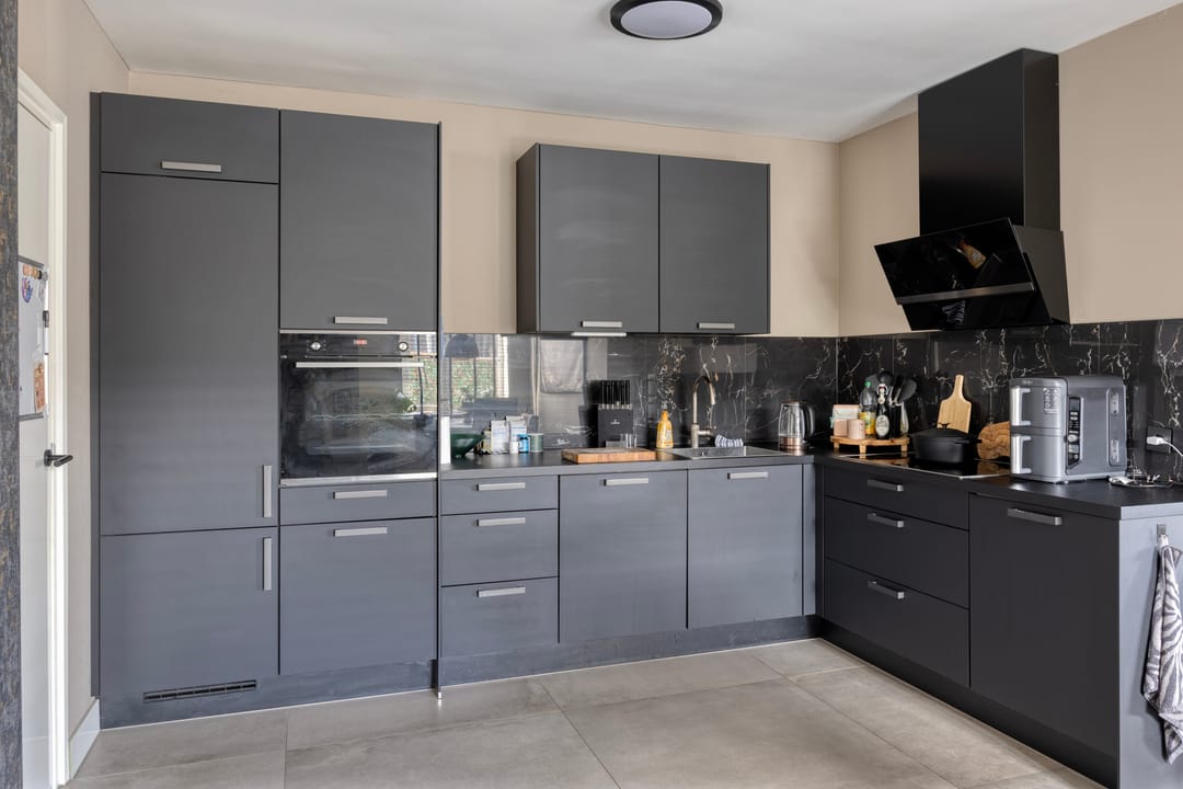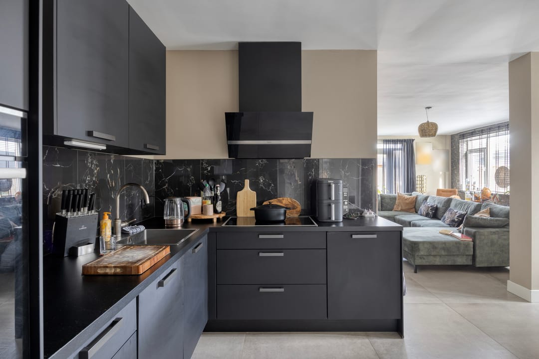 Entree, hal, met toilet en doorgang naar de woonkeuken, voorzien van zeer luxe keuken. Hier bevindt zich de trapopgang naar de 1e etage en de ruime was/bergruimte. Vanuit de keuken is de lichte en zeer ruime woonkamer te bereiken met uitzicht op de diepe en zonnige tuin.