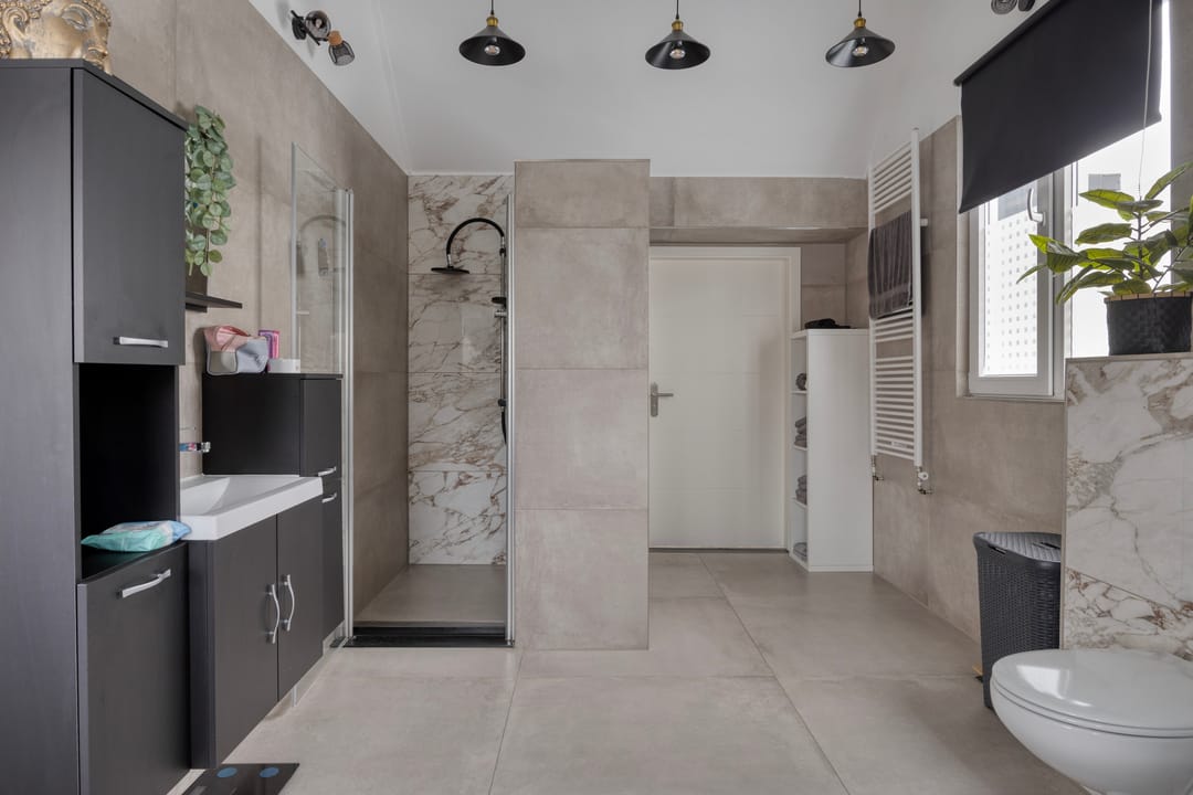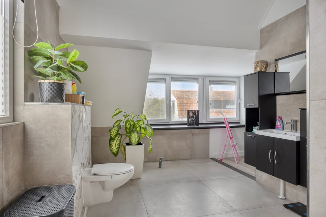 Overloop, 3 zeer ruime slaapkamers en een ruime badkamer met douche, toilet en wastafel. In de badkamer is eenvoudig een ligbad te plaatsen.