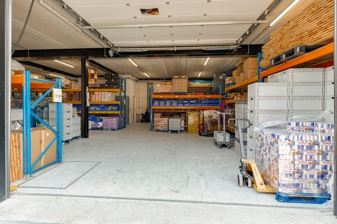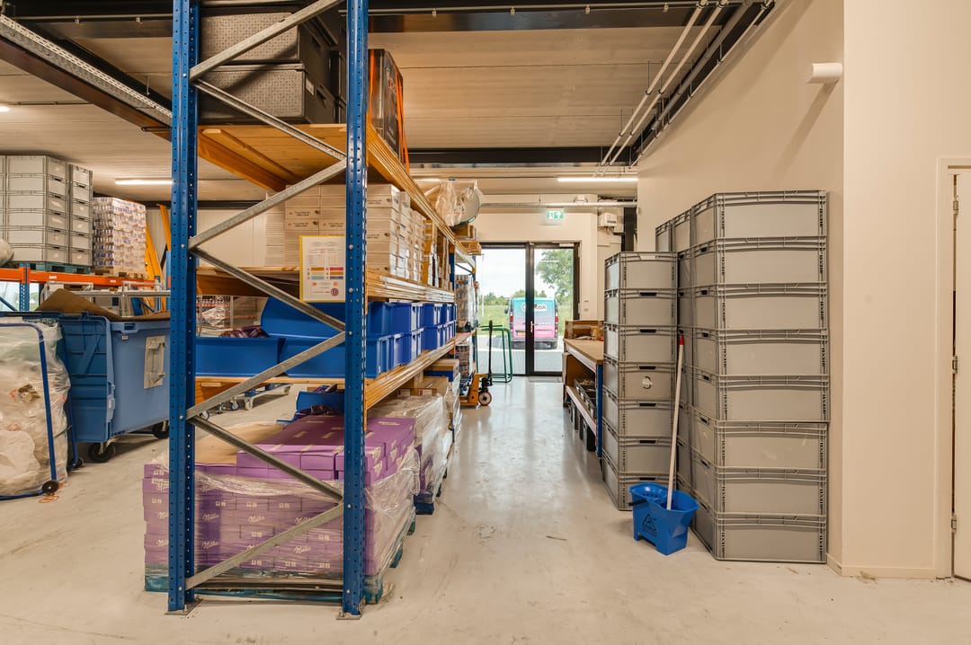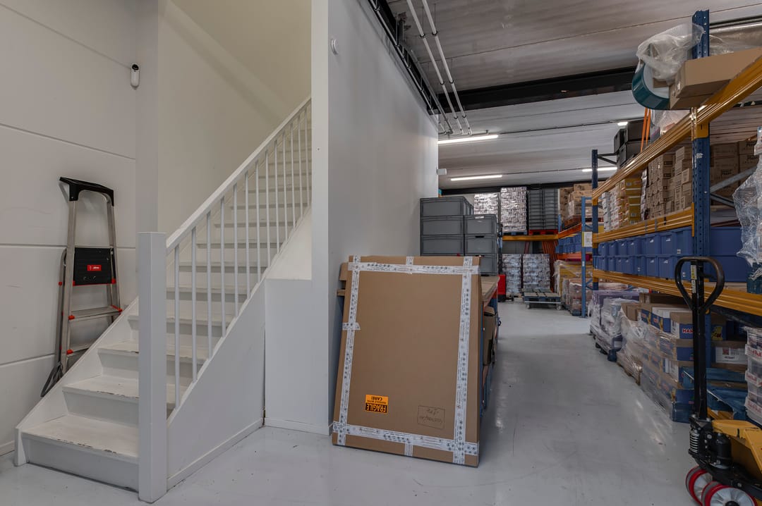 Entree middels glazen pui aan de voorzijde van de unit, meterkast, open bedrijfsruimte met in de zijgevel een grote raampartij en elektrisch bedienbare overheaddeur met afstandsbediening, trap naar kantoorverdieping.
