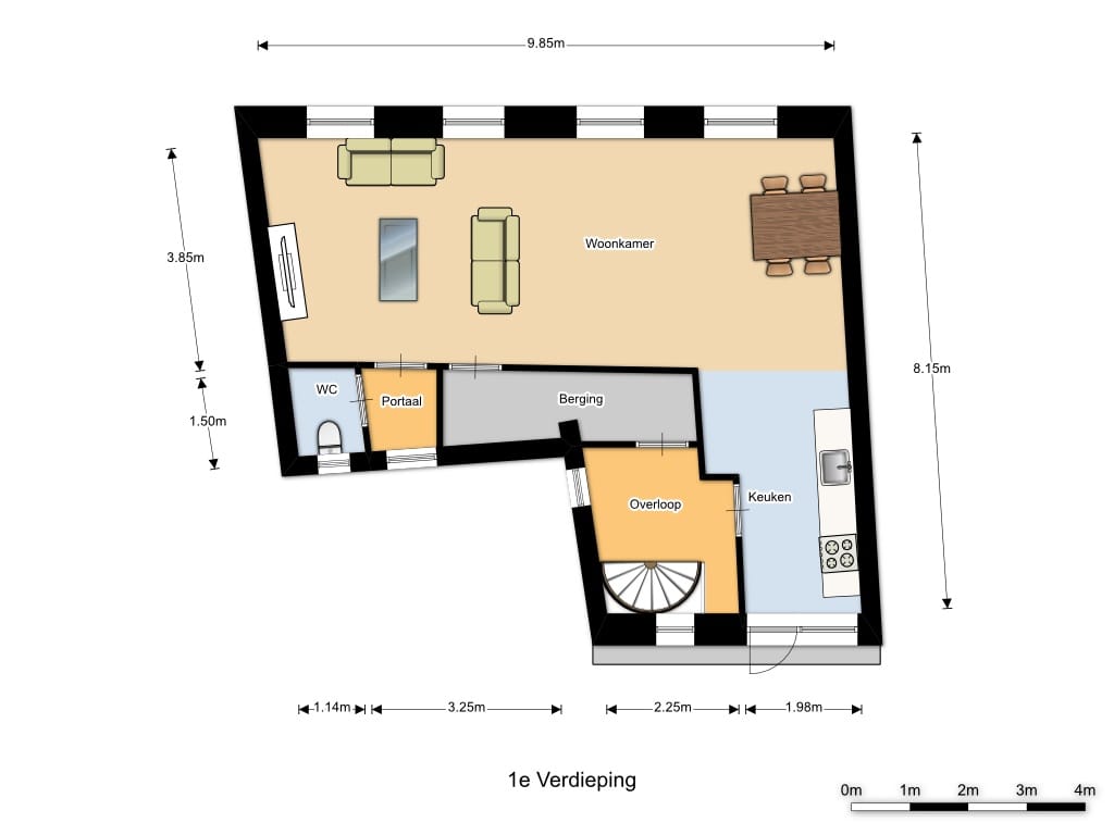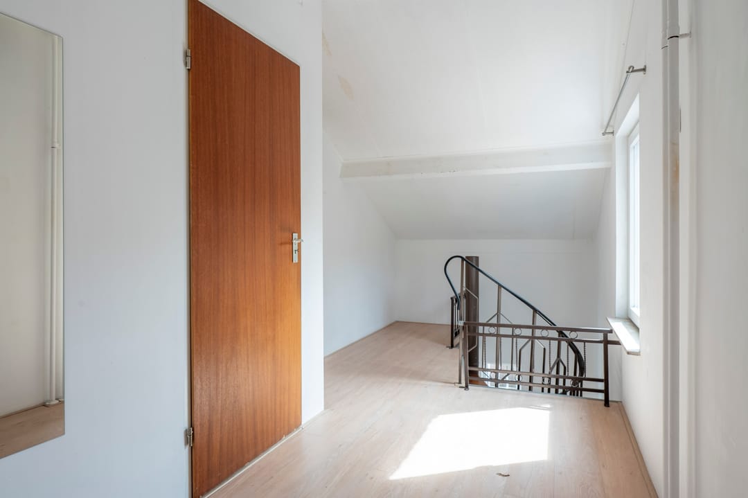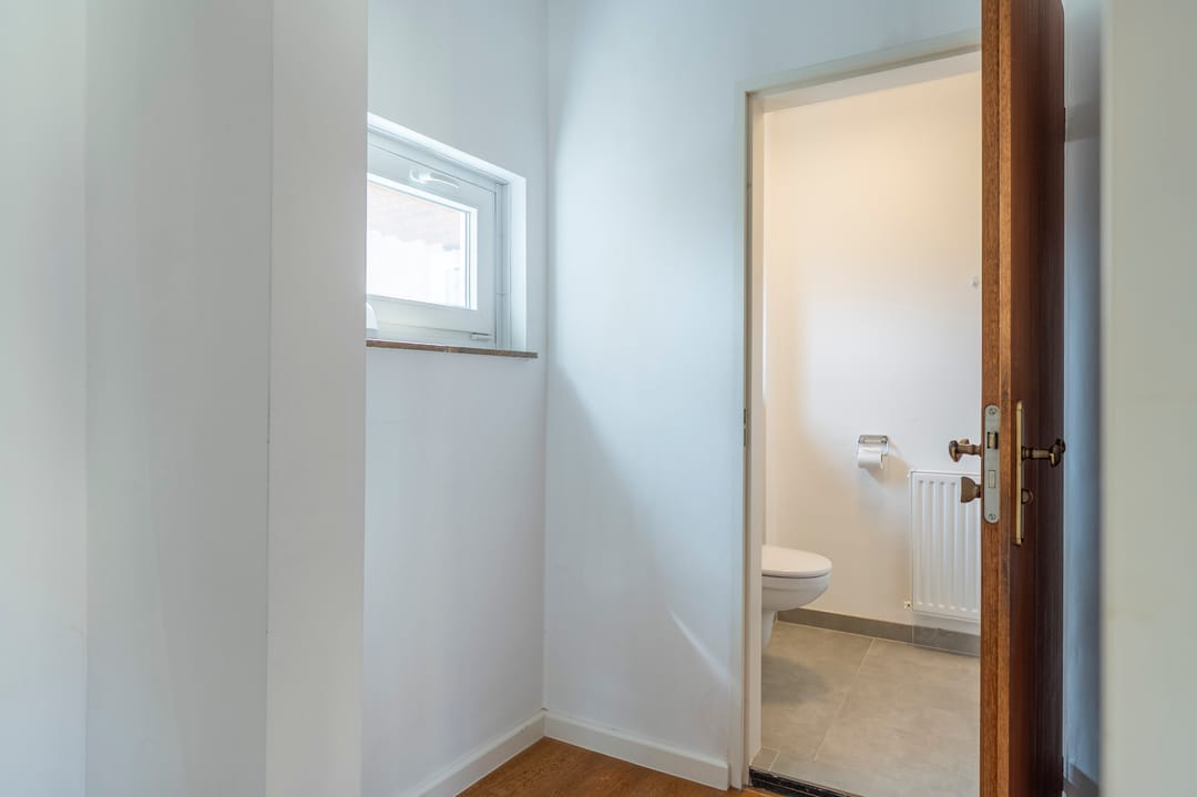 Overloop met parketvloer en een grote bergruimte. Tussenportaal met moderne toiletruimte met hangcloset en fonteintje. Aan de voorzijde van de woning bevindt zich de riante woonkamer van ca. 38 m² met parketvloer en grote kunststoffen ramen voorzien van HR++ beglazing.