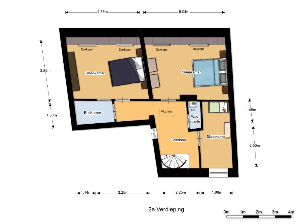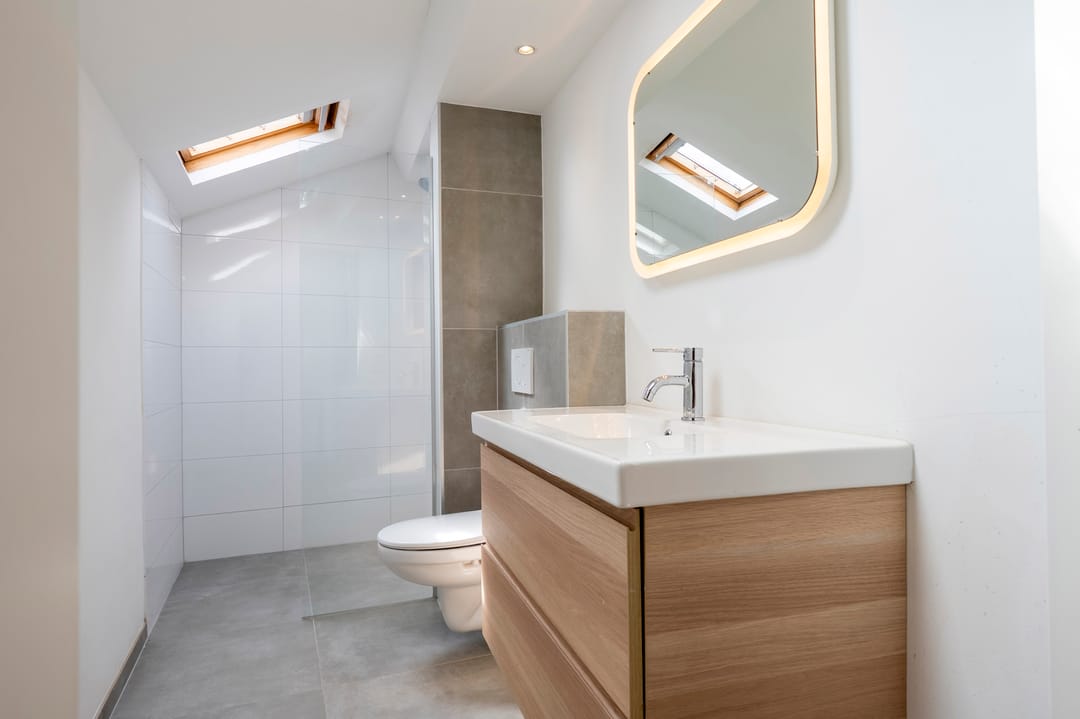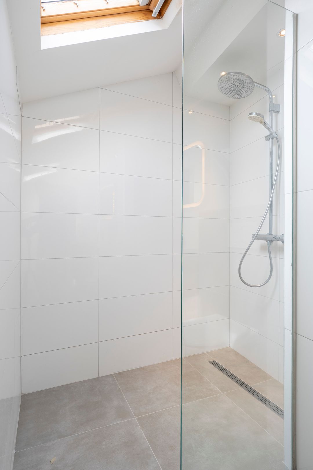 Ruime overloop. 3 slaapkamers (ca. 19, 18 en 9 m²) allen voorzien van een laminaatvloer. Moderne badkamer voorzien van inloopdouche, hangcloset en grote wastafel in badmeubel. Wasruimte met witgoedaansluitingen en cv-installatie.