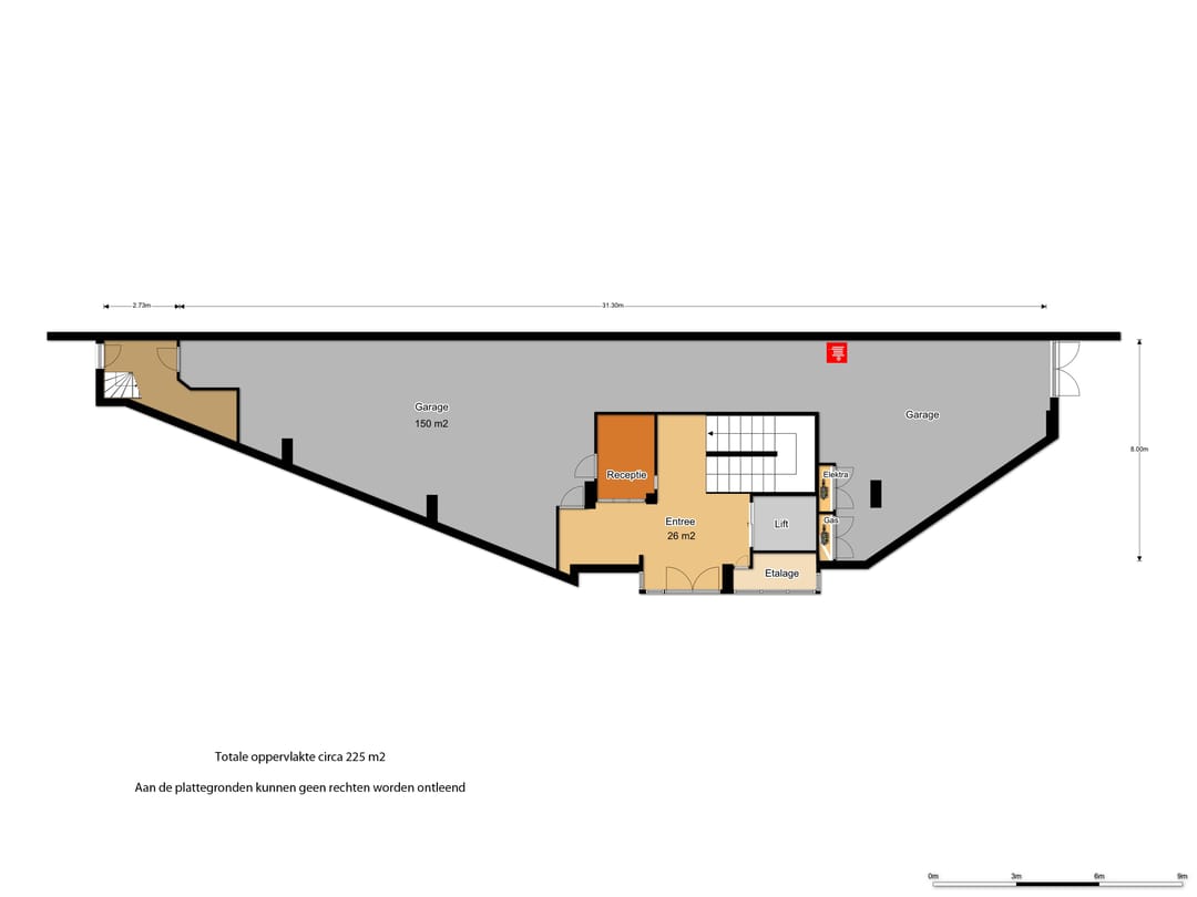 Circa 225 m² commerciële ruimte, bestaande uit een entree met receptiebalie, een separate etalage en een ruime, multifunctioneel in te richten garage/magazijn.