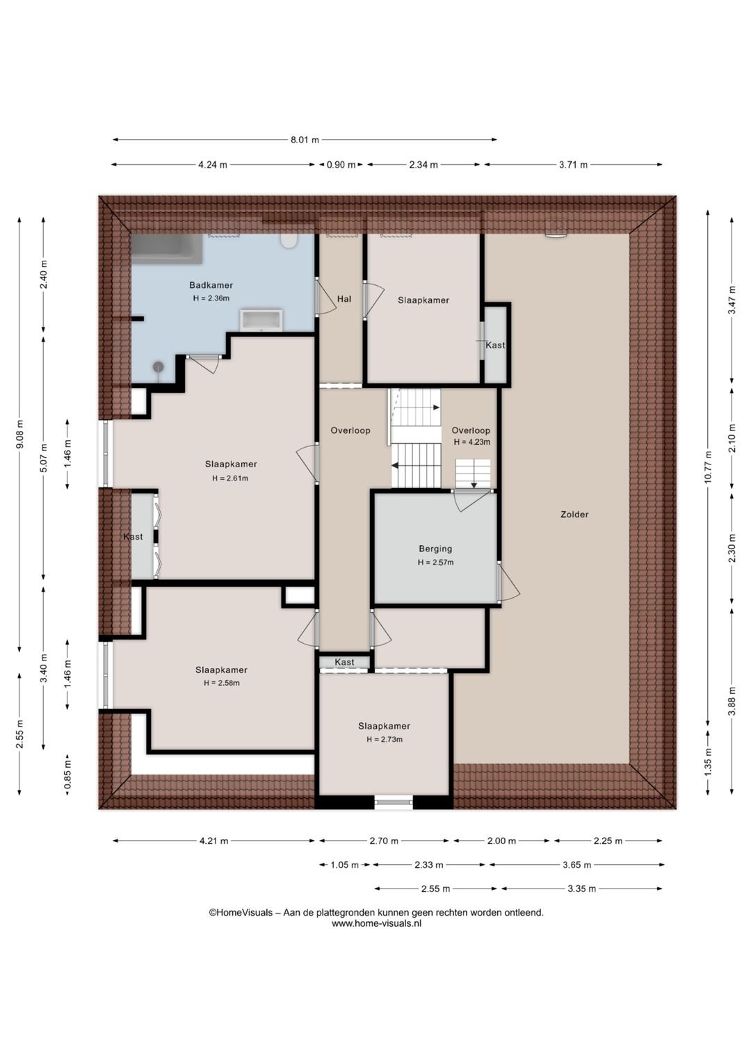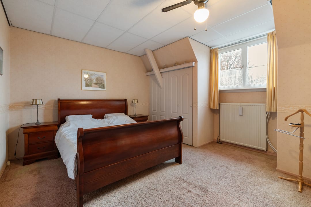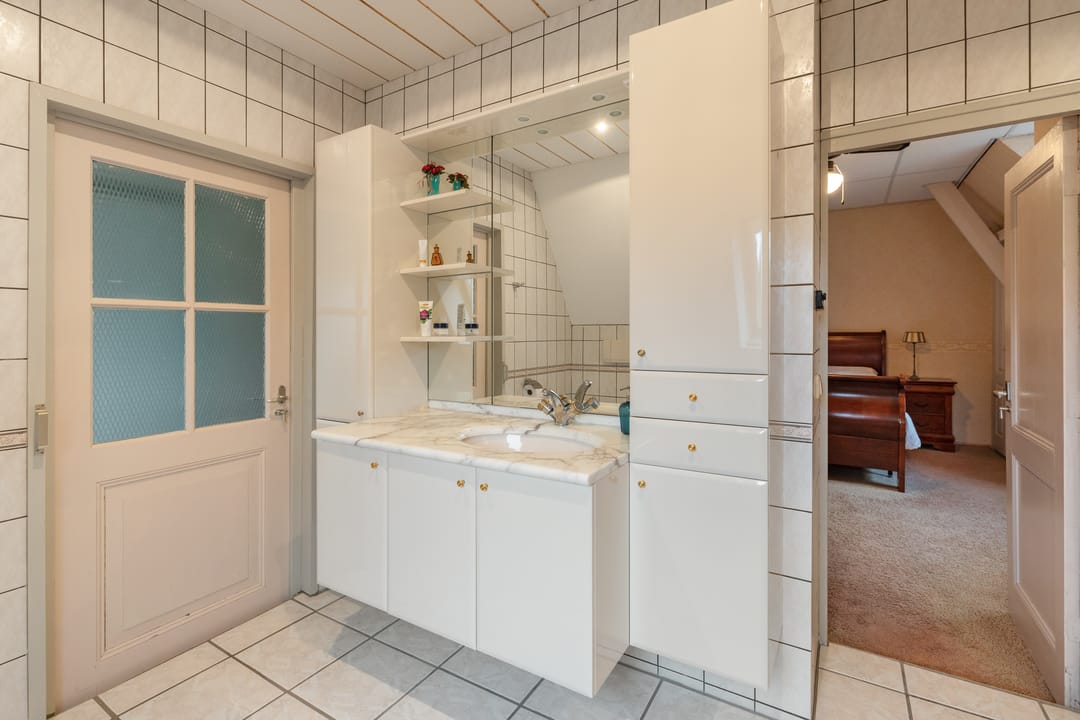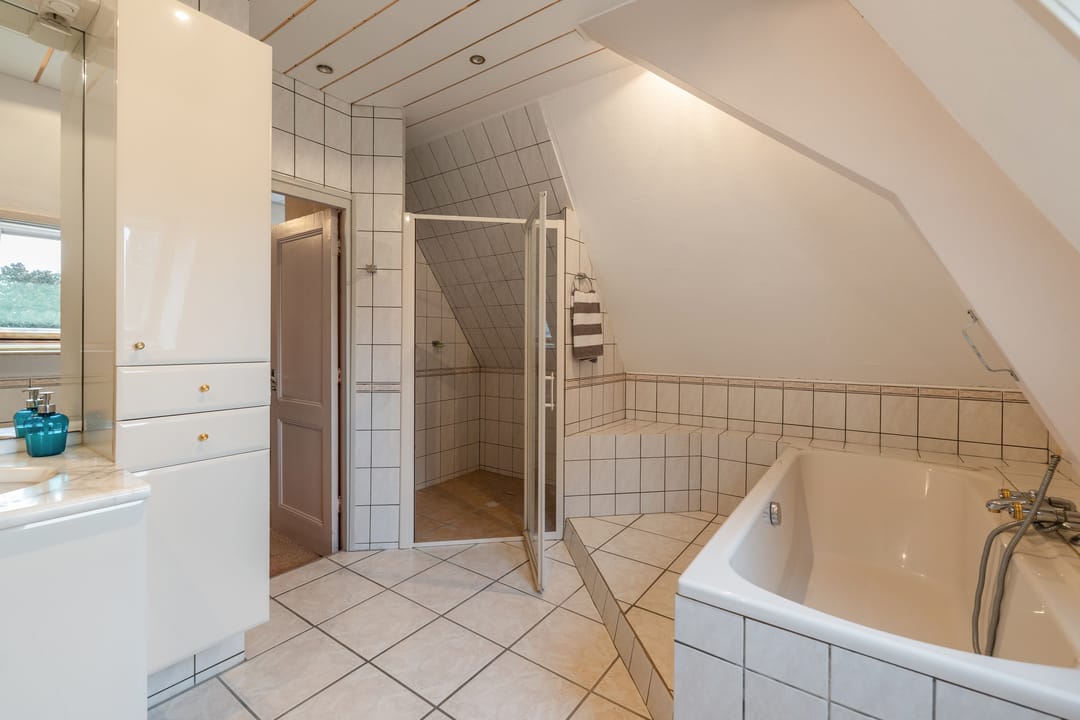 Via vaste trap toegang tot de verdieping; overloop met toegang tot vier slaapkamers en badkamer voorzien van inloopdouche, ligbad, wastafelmeubel en toilet; de badkamer is eveneens bereikbaar vanuit de grootste slaapkamer. Via overloop toegang tot inpandige ruimte met toegang tot de zolderruimte op deze verdieping.