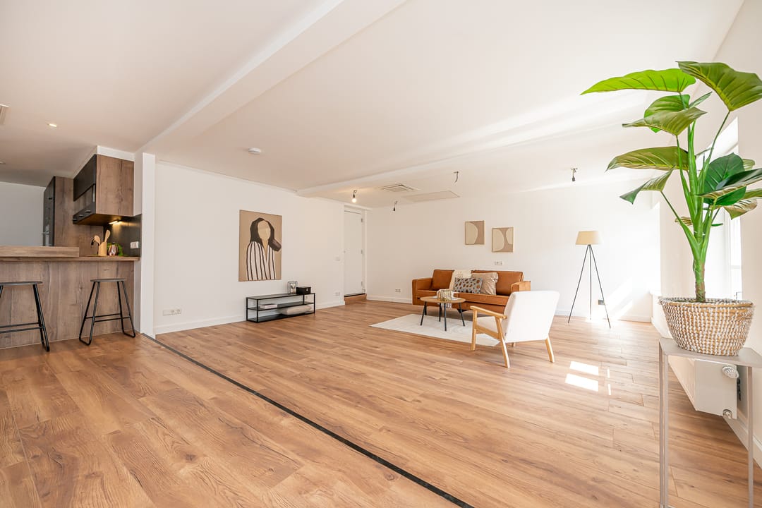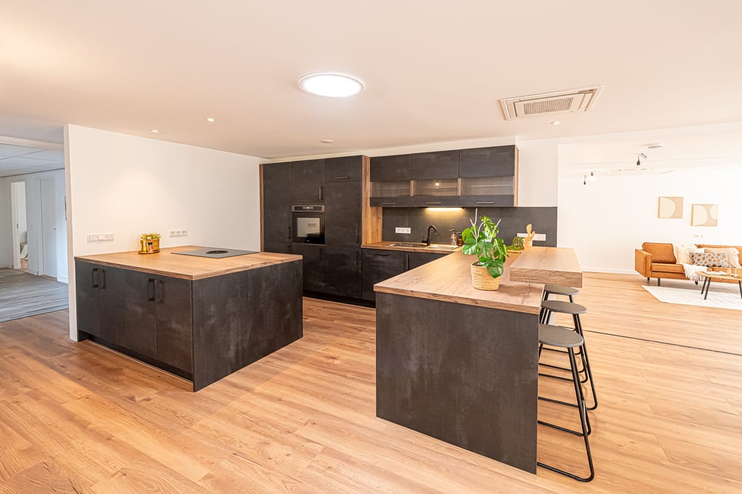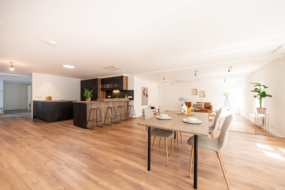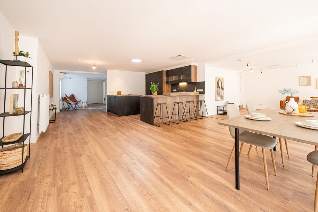 Appartement 2d (ca. 200 m² GBO) op de eerste verdieping is ruim opgezet en bereikbaar via een eigen opgang tussen de winkelruimtes. De brede trapopgang tussen de winkels is ruim genoeg voor het plaatsen van een traplift, waardoor het appartement ook levensloopbestendig gemaakt kan worden. De woning beschikt over twee voordeuren, wat het gebruik flexibel maakt. Binnen is de ruimte praktisch ingedeeld, met een royale woonkamer met airco en open keuken met schiereiland in het midden van het appartement. Aan beide zijden van de woning bevinden zich één of meerdere slaapkamers, elk met toegang tot een eigen badkamer en apart toilet. Deze opzet maakt het appartement niet alleen geschikt voor eigen bewoning, maar ook voor gebruik als meergeneratiewoning. Denk bijvoorbeeld aan een ouder of kind die mee en zelfstandig onder één dak woont, met voldoende privacy en eigen voorzieningen. Ook andere vormen van samenwonen zijn hier goed denkbaar. Het ruime dakterras aan de achterzijde biedt bovendien extra leefruimte buiten. Via een vlizotrap is een ruime bergzolder bereikbaar, ideaal voor extra bergruimte. Deze bovenwoning biedt daarmee niet alleen veel woonoppervlak, maar ook praktische voorzieningen voor dagelijks gebruik. Het appartement heeft een eigen parkeerplaats en een fietsenstalling op de begane grond