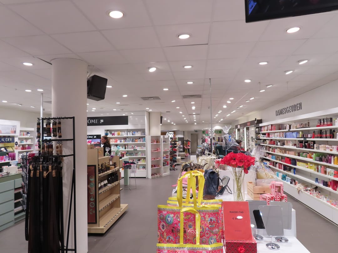 Winkel, verkoopruimte, pantry, toilet, kantoor, kantine, een tweetal behandelkamers, magazijn met een achterom te bevoorraden vanaf de Bilderdijkplein.