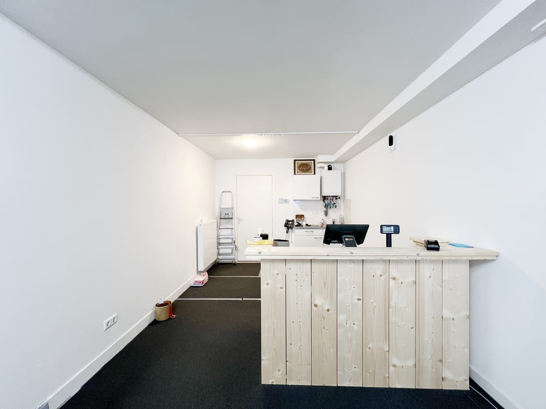 Ingang winkelruimte doorlopend naar achteren waar zich een deels afgesloten ruimte bevindt met een eigen pantry, deze ruimte biedt vervolgens de toegang tot een afgesloten inpandige berging en een eigen toiletvoorziening met wastafel.