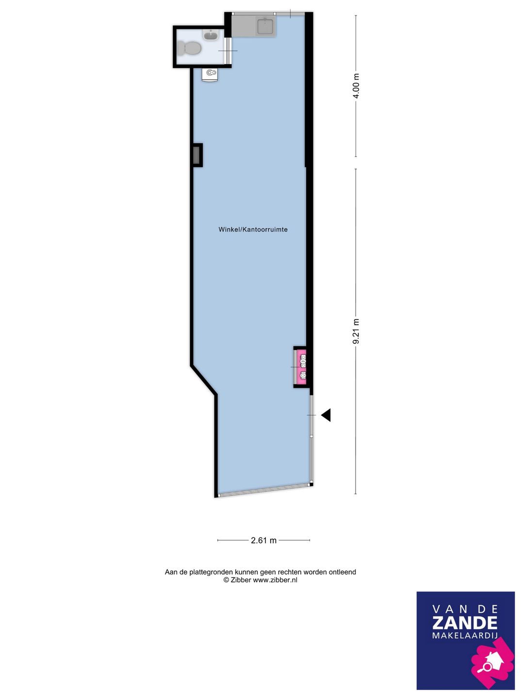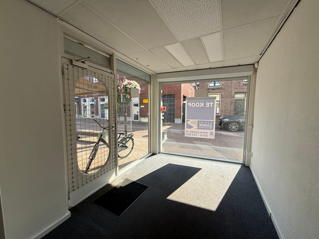 Entree, open winkelruimte, opslag/kantine met pantry, buitenplaats met berging.