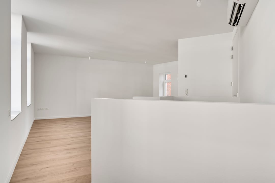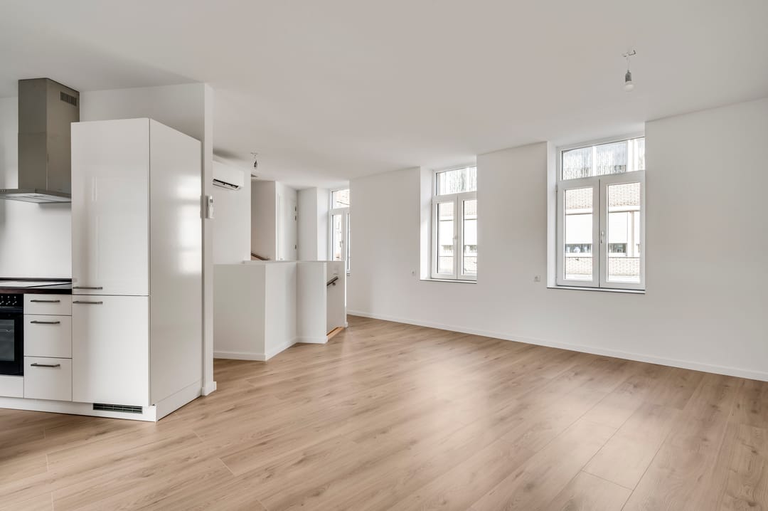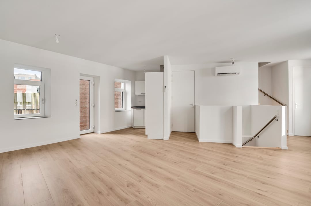 Woonkamer: royale en sfeervolle met laminaatvloer, loopdeur naar dakterras en veel lichtival, airco-unit, in open verbinding keuken met complete aanbouwkeuken met keramisch kookplaat, koelkast, diepvriezer, afzuigkap, vaatwasser.