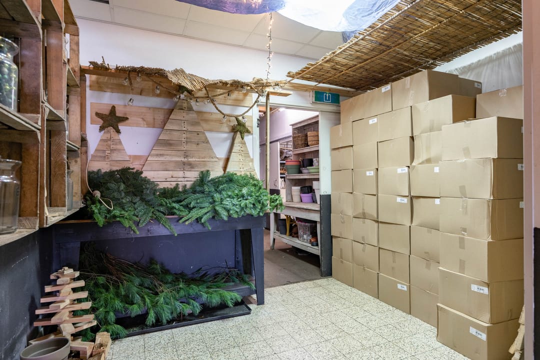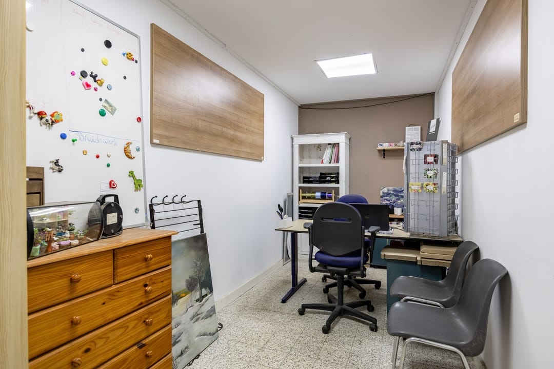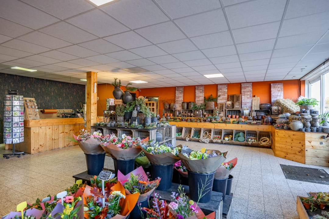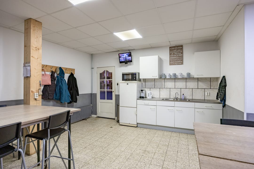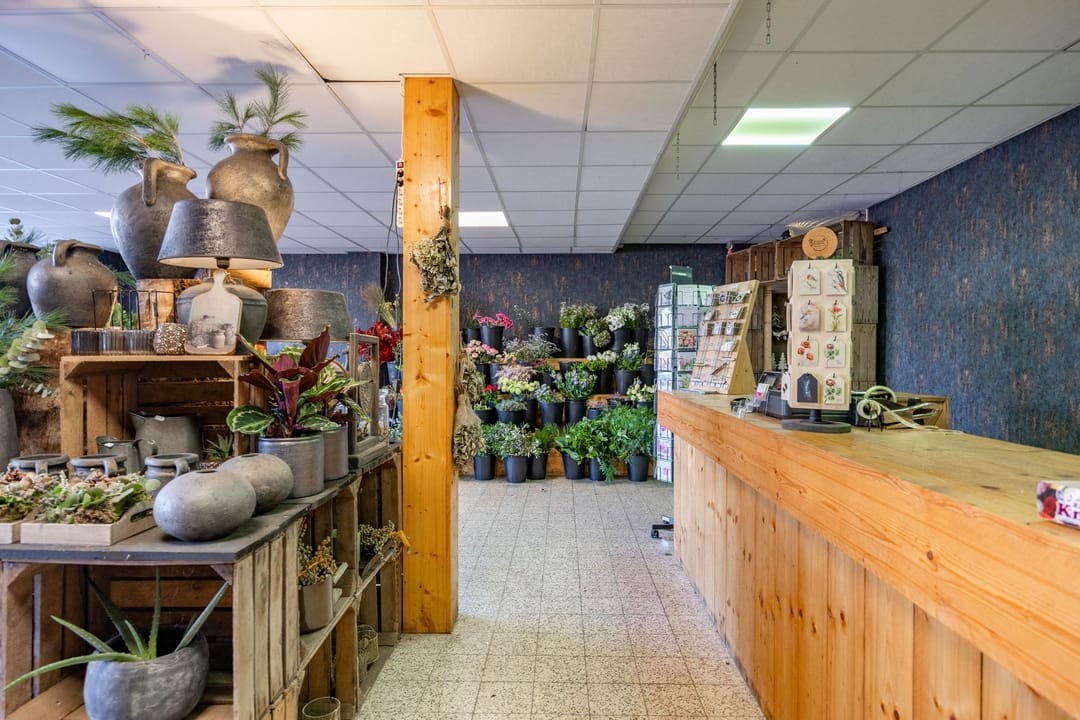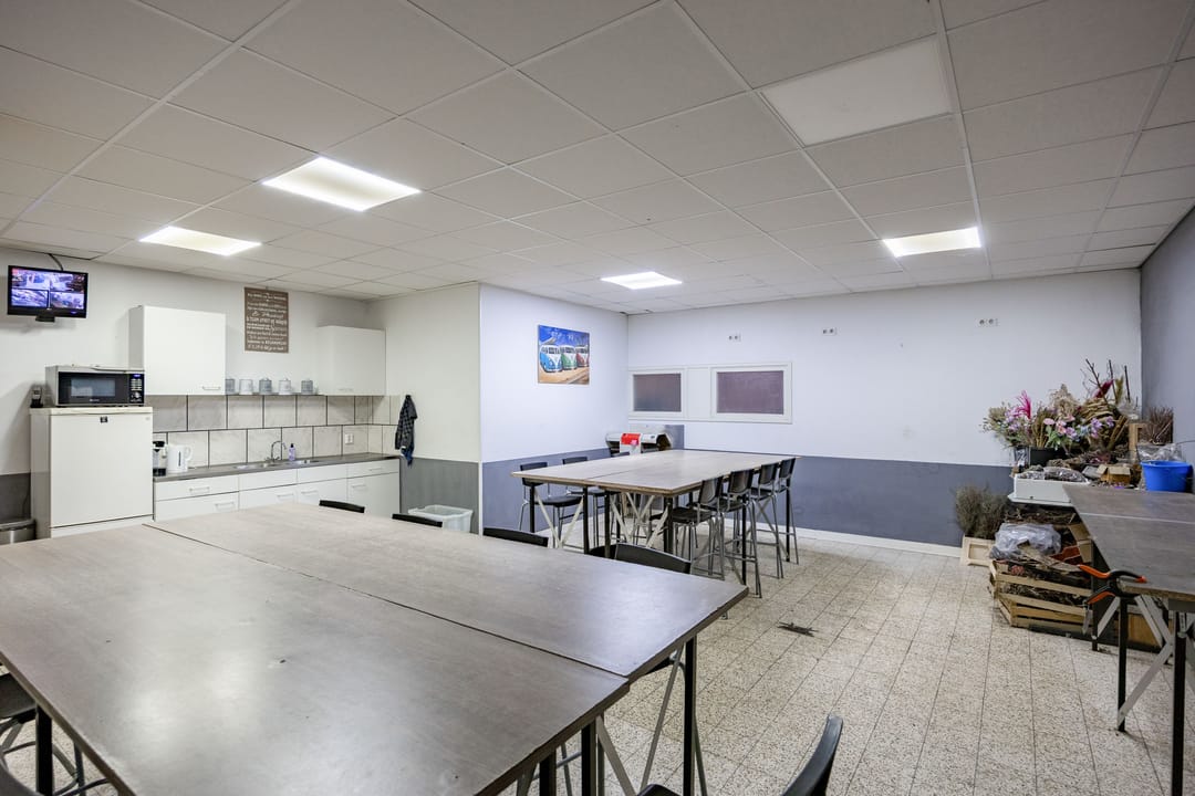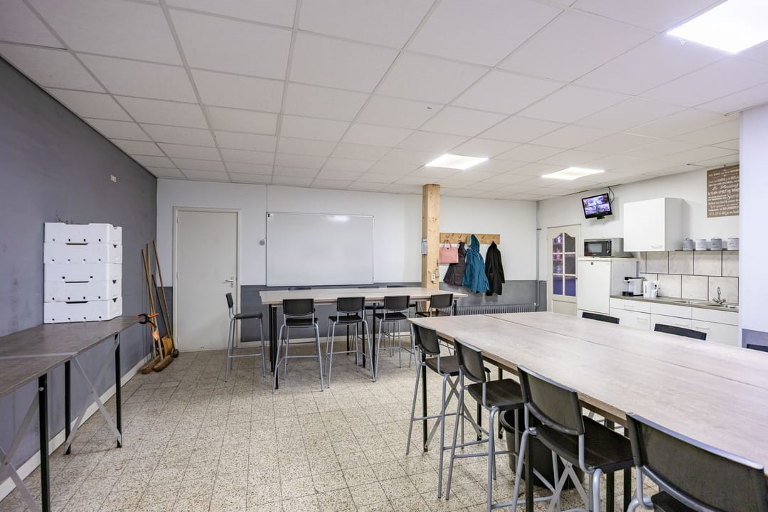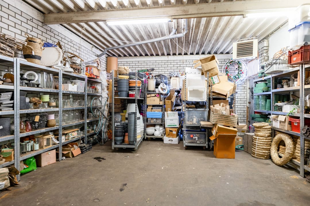Via de ingang aan de voorzijde stappen we de winkel binnen. Deze ruimte beslaat ongeveer 98 m². In het midden van het pand is een opslagruimte gecreëerd (ca. 11 m²) en een kantine met eenvoudig keukenblok van ca 44 m² die uit het directe zicht van klanten is gelegen. Dit alles is voorzien van een plavuizen vloer en systeemplafond. Aan de achterzijde is nog eens ca 47 m² aan opslagruimte met een apart toilet gelegen. Deze zijn voorzien van een betonvloer en zou ook bij de winkel kunnen worden betrokken, zodat er een ‘doorloop’ kan worden gecreëerd.