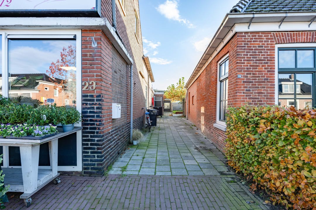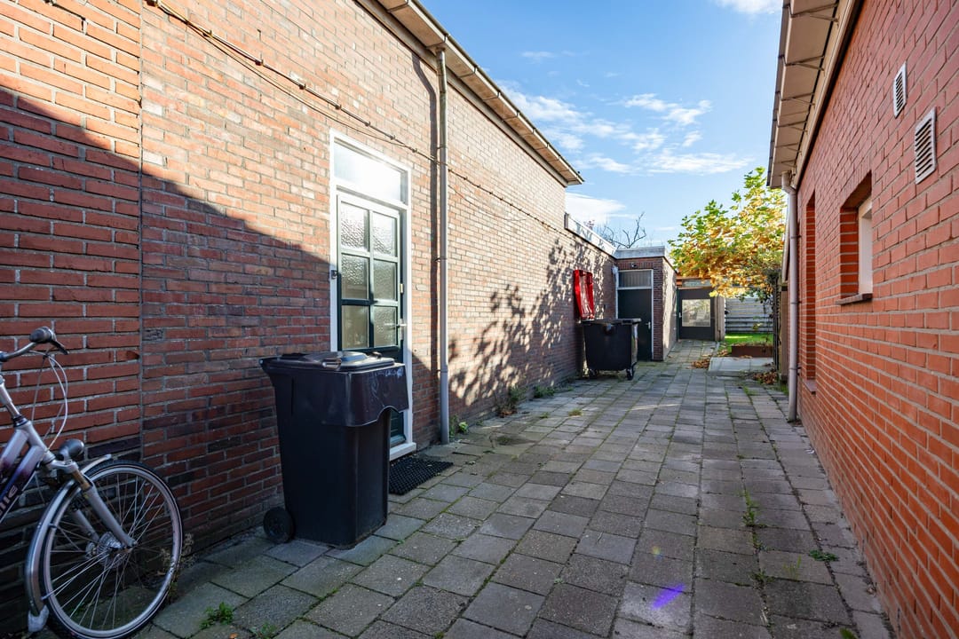 Via de brede steeg aan de zijkant van het pand is de achterzijde te bereiken. Hier is een grote overkapping (ca. 100 m²) gerealiseerd dat extra mogelijkheden of opslagruimte biedt.