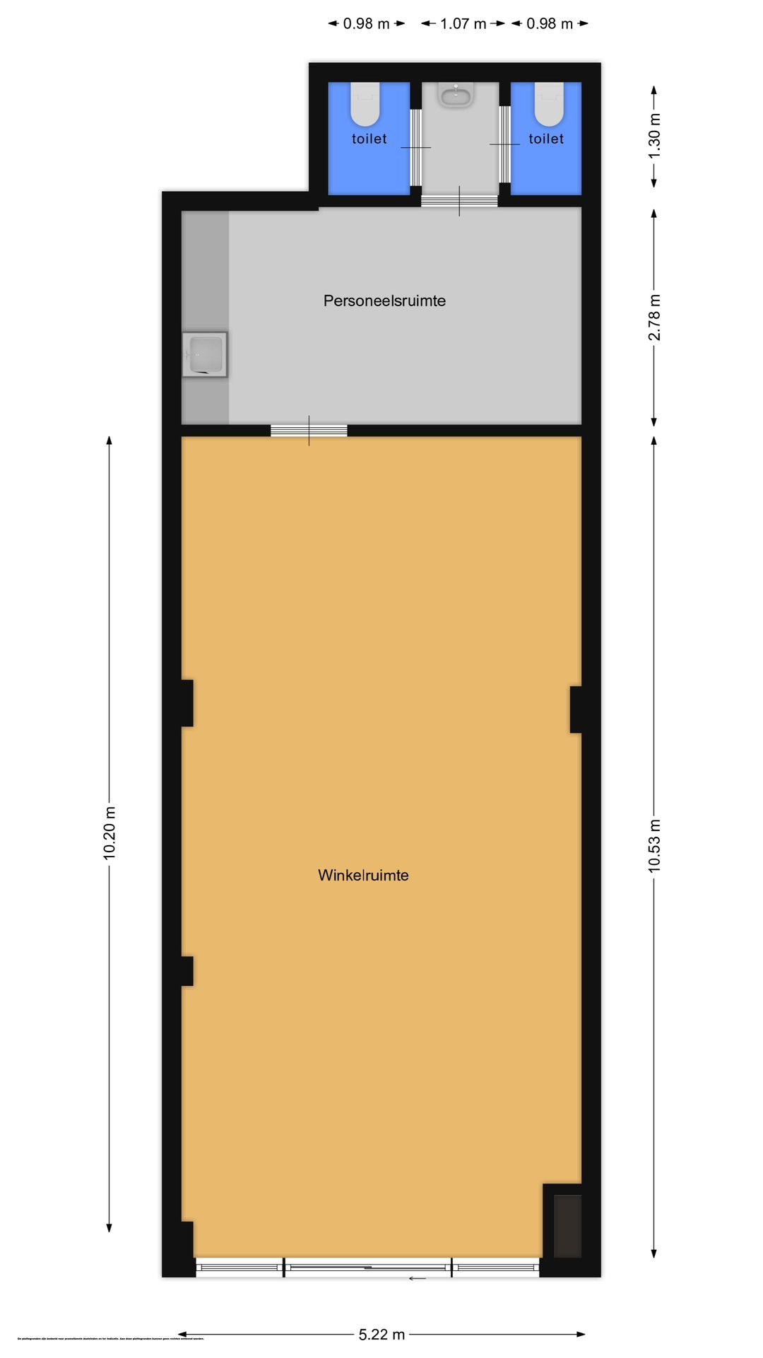 De winkelruimte ligt aan de voorzijde van het pand en bestaat uit één langgerekte open ruimte met een breed front. Achter de winkel bevindt zich een kantine met pantryvoorziening. Aan de achterzijde zijn twee separate toiletten gesitueerd, bereikbaar vanuit de kantine.