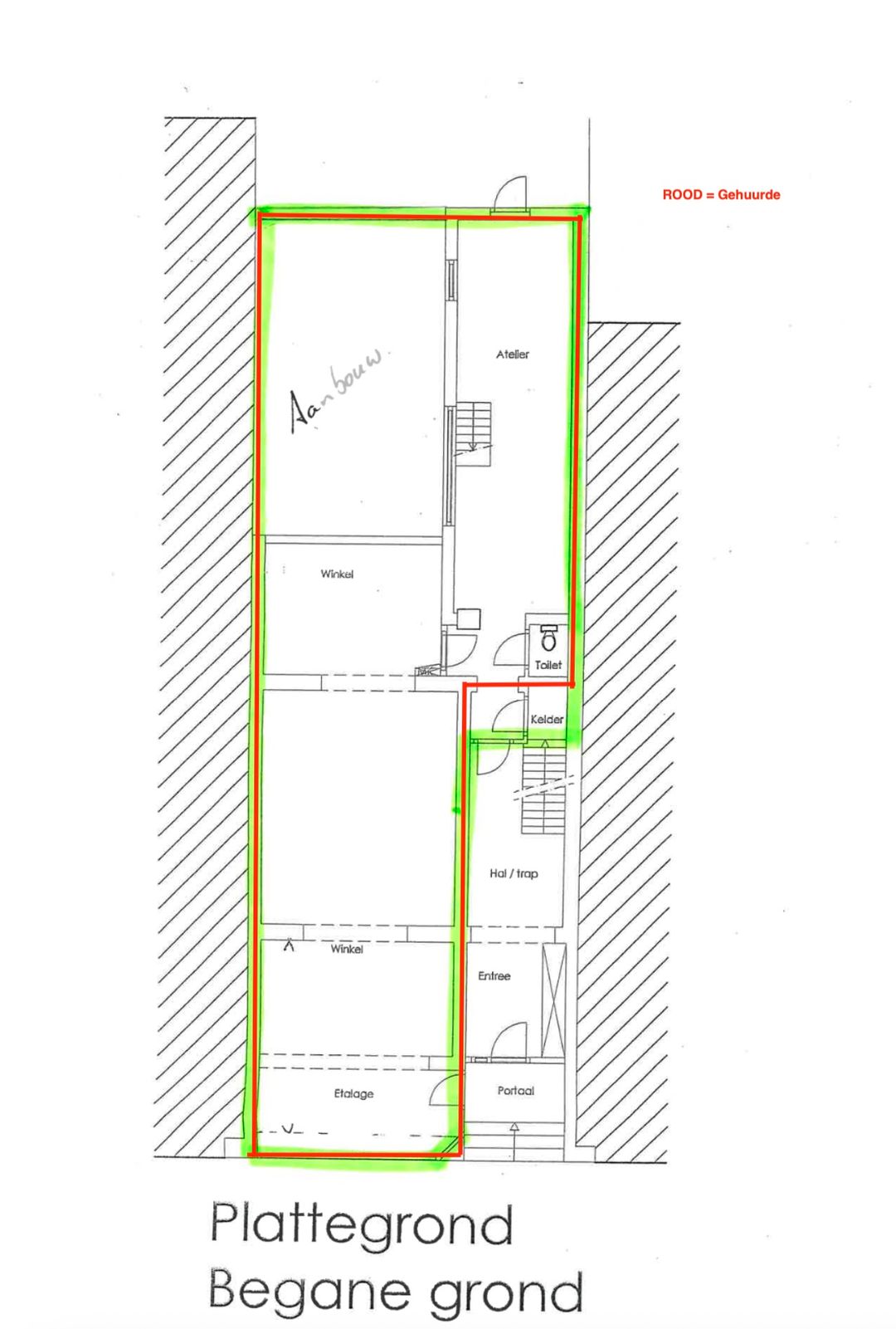 Te huur : ca. 145 m² BVO winkelruimte op begane grond, ca. 25 m² magazijn- / opslagruimte op de 1e verdieping en een achtergelegen tuin.