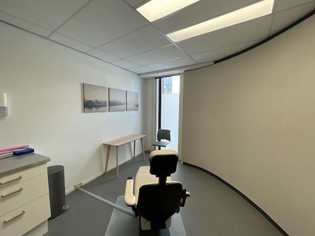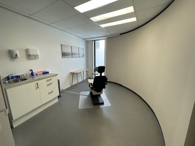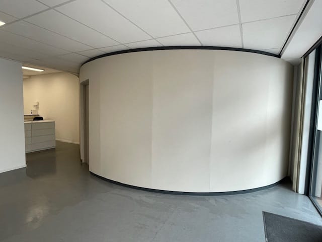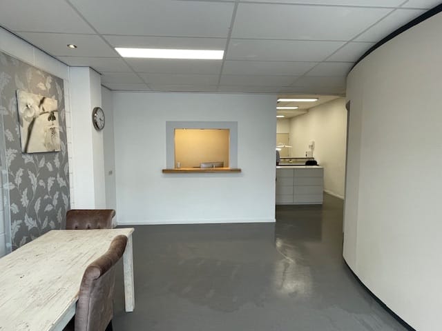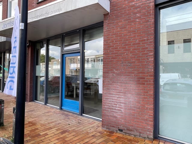 Aan de voorzijde bevindt zich een brede glazen pui met daarachter een royale ontvangstruimte. Links van de entree is een halfronde wand geplaatst met daarachter een praktijkruimte voorzien van een keukenblok en daglichttoetreding.