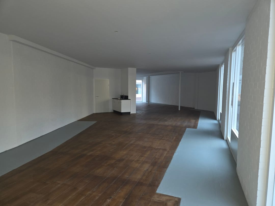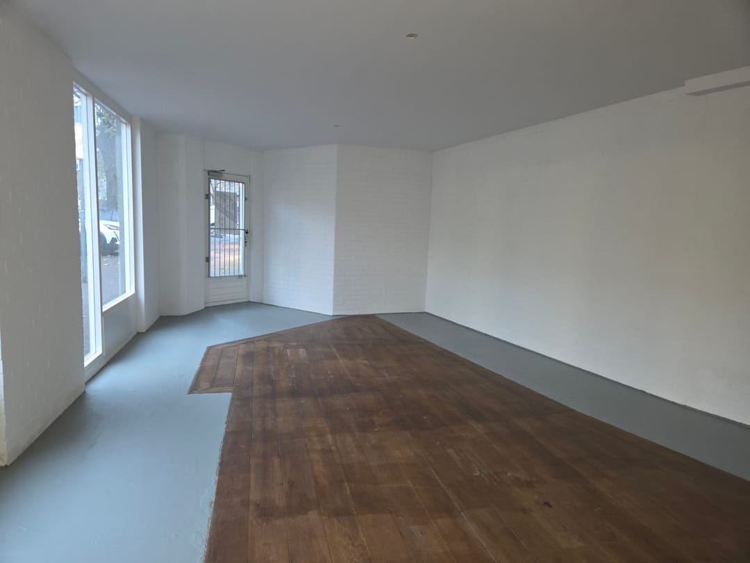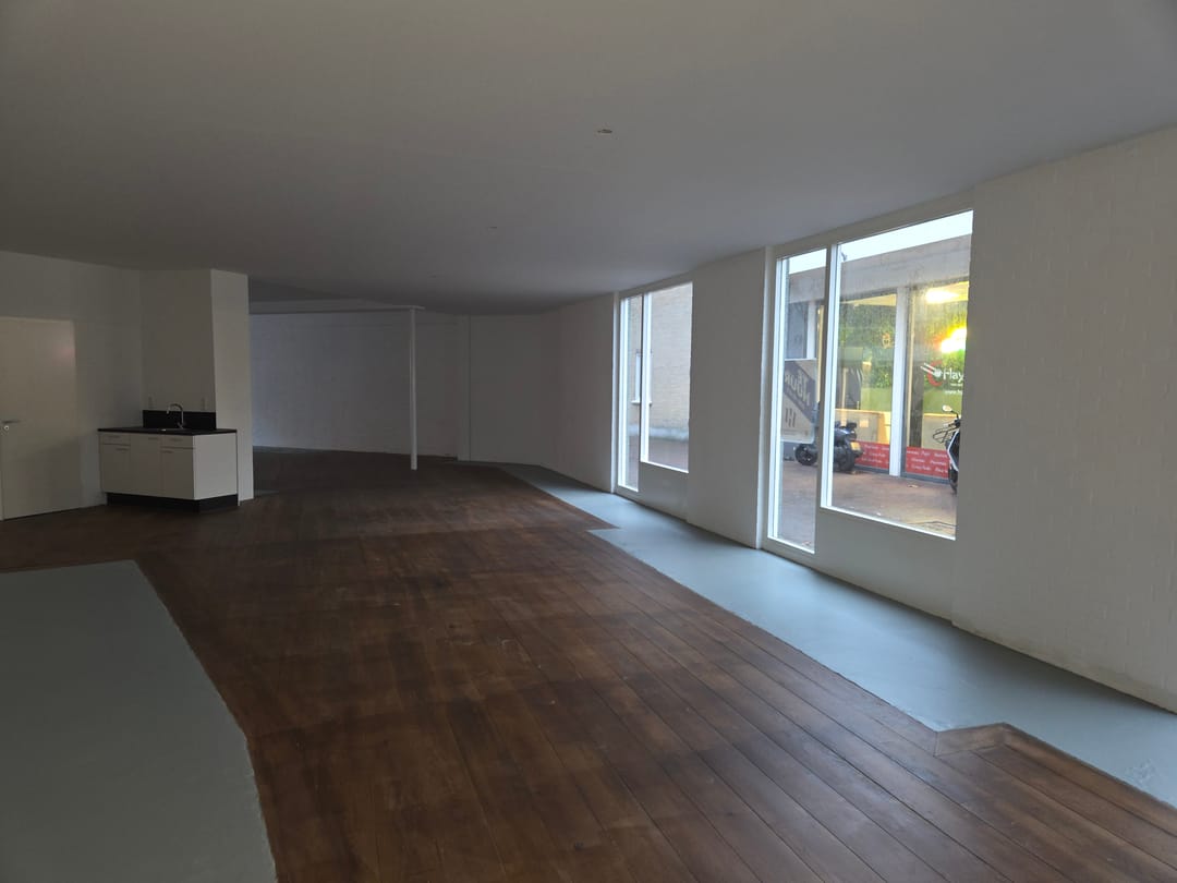 Drie grote raampartijen aan de zijkant zorgen voor veel natuurlijk daglicht, waardoor de ruimte een open en uitnodigende sfeer uitstraalt. Perfect om uw producten of diensten optimaal te presenteren.