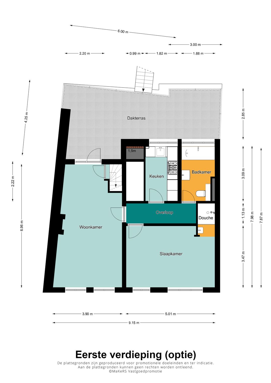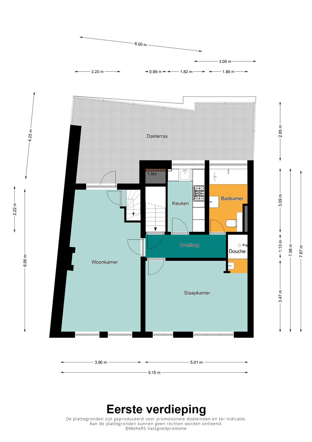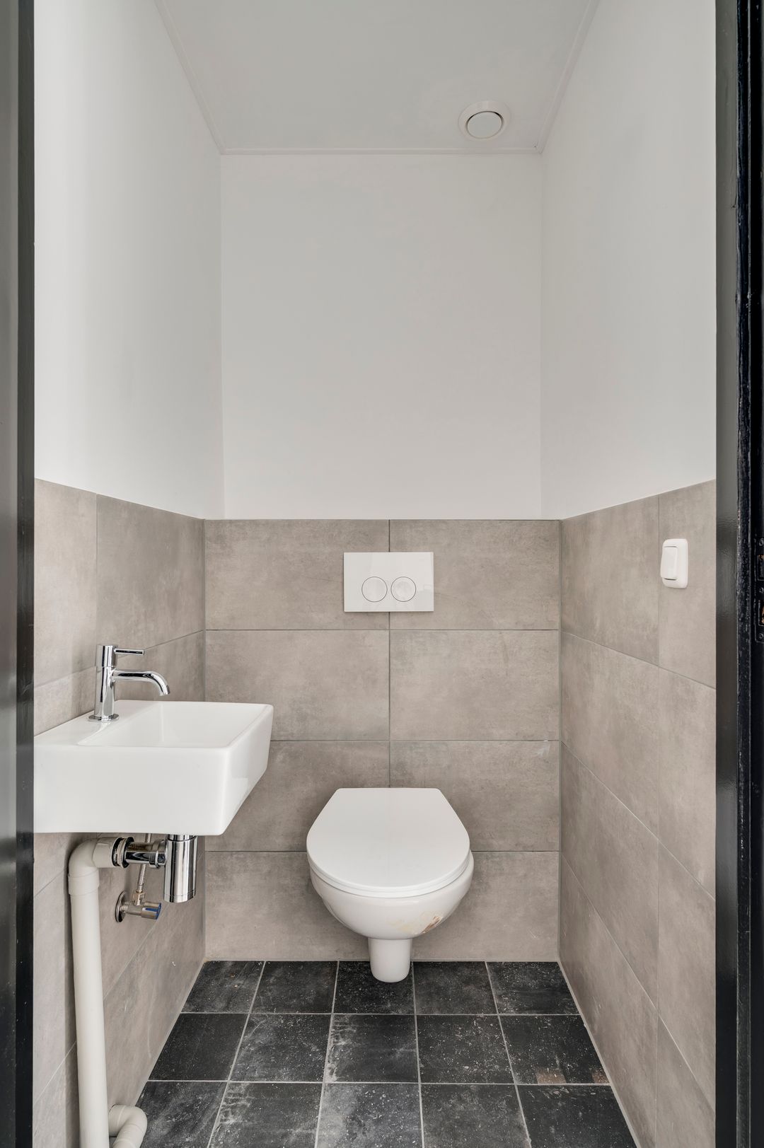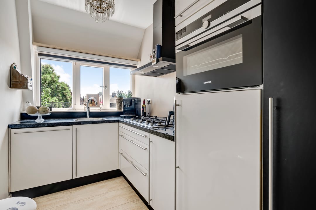 Overloop, gezellige woonkamer met toegang naar het heerlijk rustige dakterras, slaapkamer met doucheruimte, gesloten keuken met moderne keuken opstelling, badkamer met ligbad, vaste wastafel en toilet.
