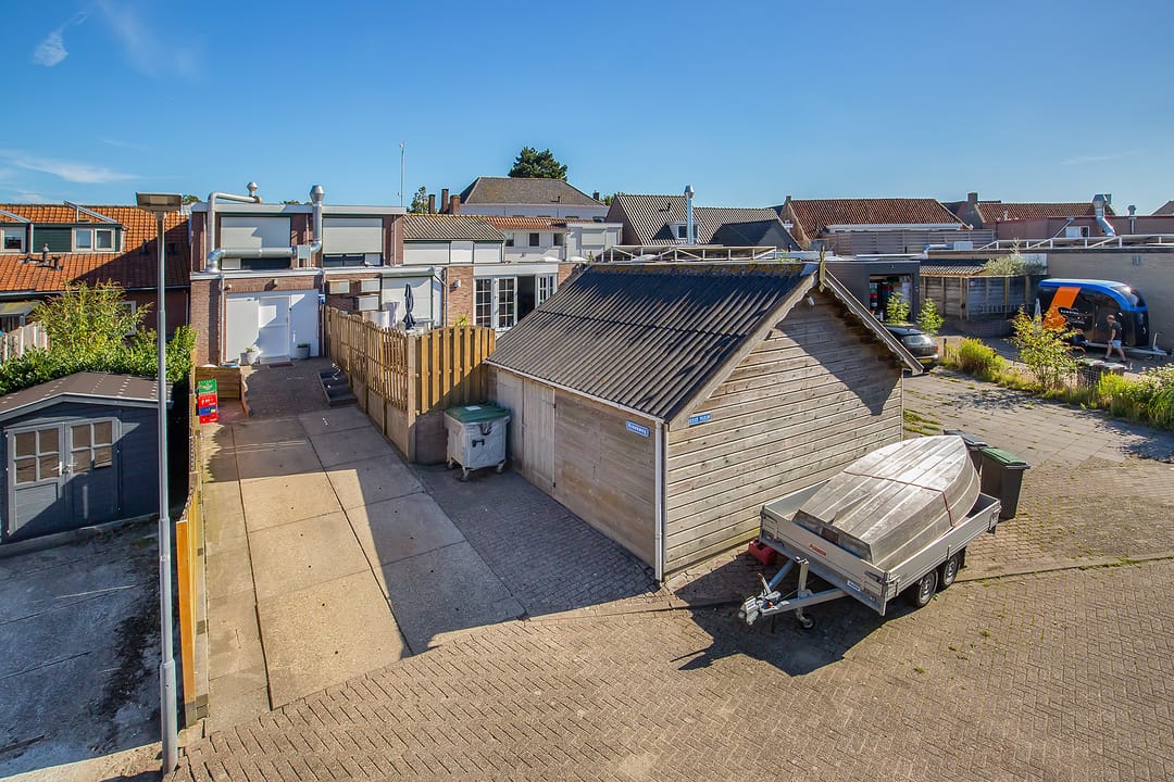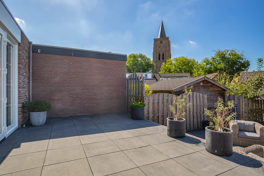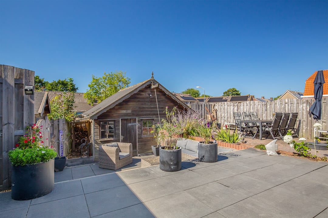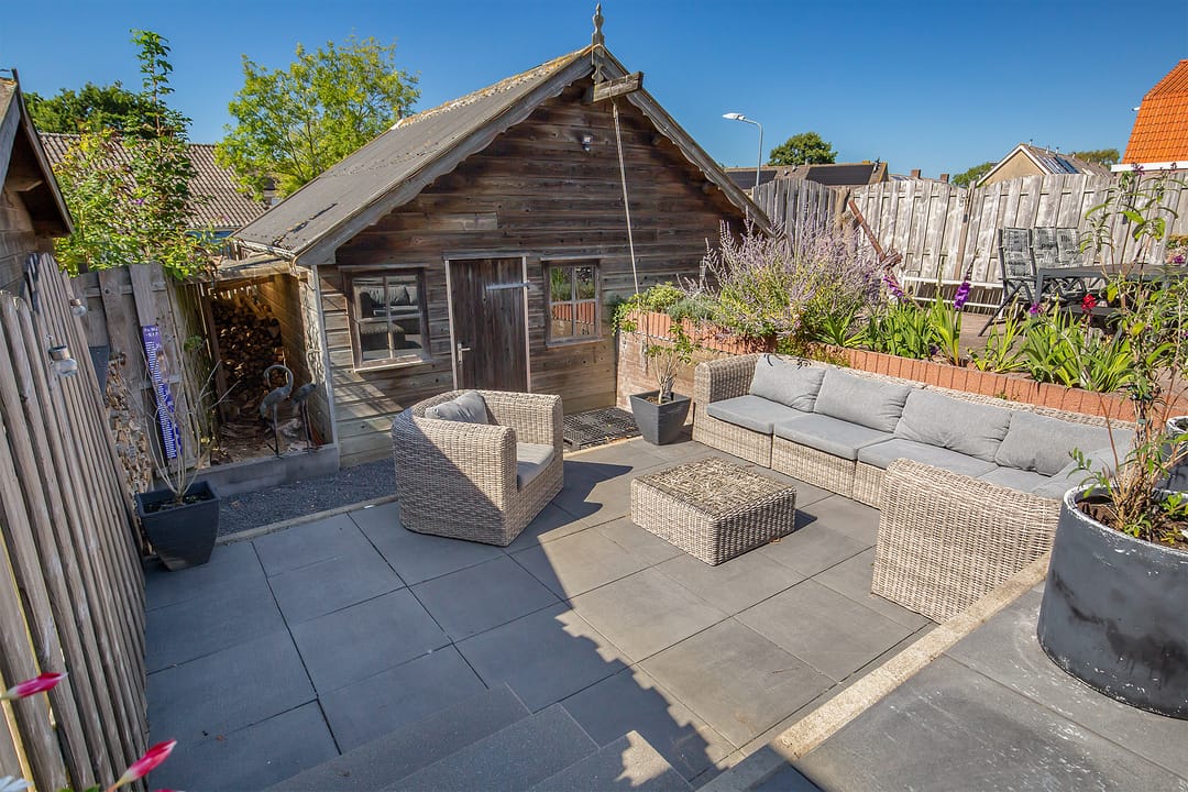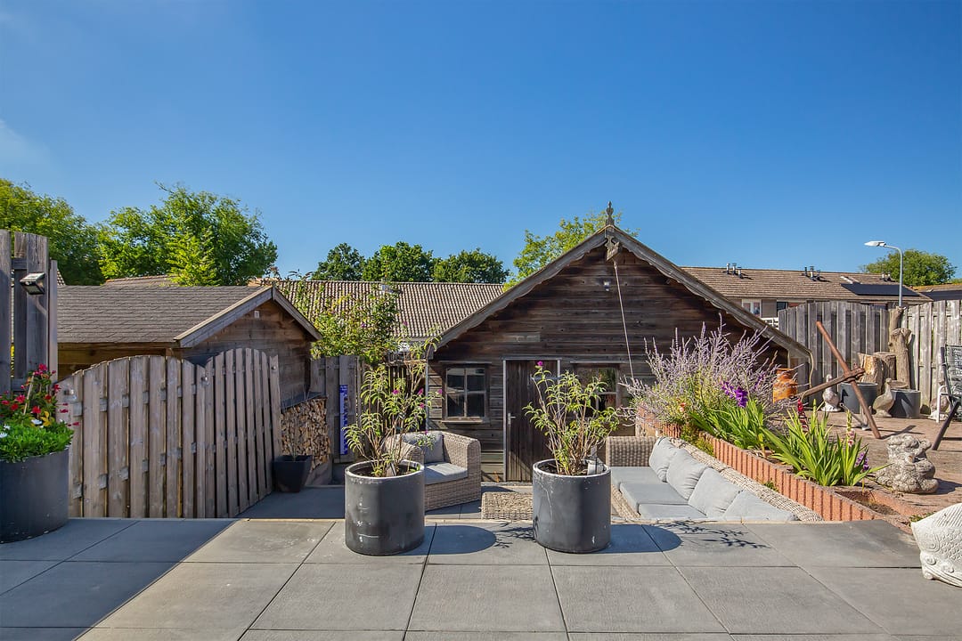 Aan de achterzijde een royale tuin met diverse terrassen en een vrijstaande houten berging.