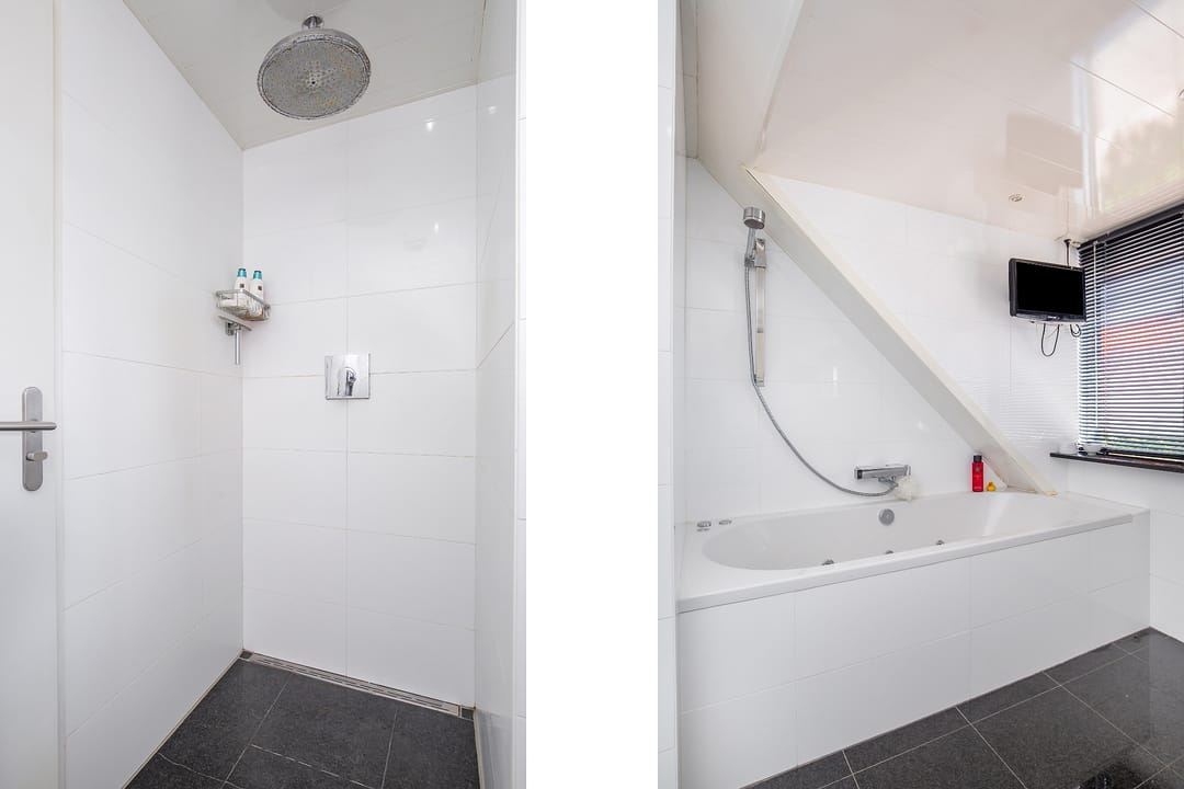 Het woongedeelte is voorzien van woonkamer met open keuken. Verder een hal met toilet. Middels een vaste trap is de eerste verdieping bereikbaar en hier bevinden zich 5 (slaap)kamers en een badkamer met ligbad, douche, toilet en wastafel.