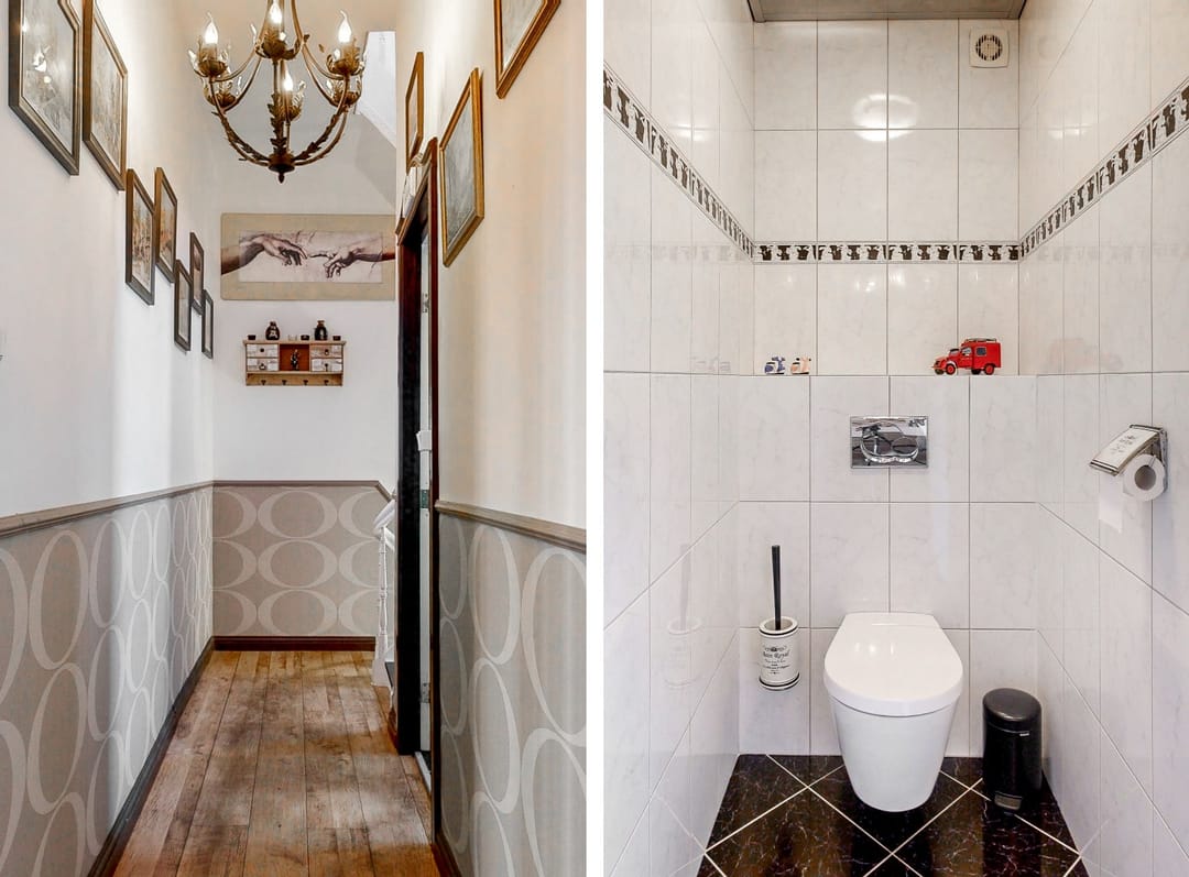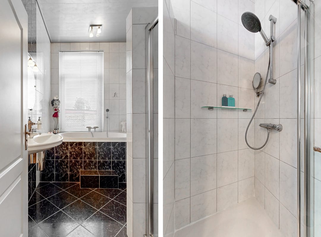 Ook de badkamer bevindt zich op de eerste verdieping. Deze beschikt over een wastafel, een ligbad en een douche. Het toilet bevindt zich apart op de eerste verdieping.