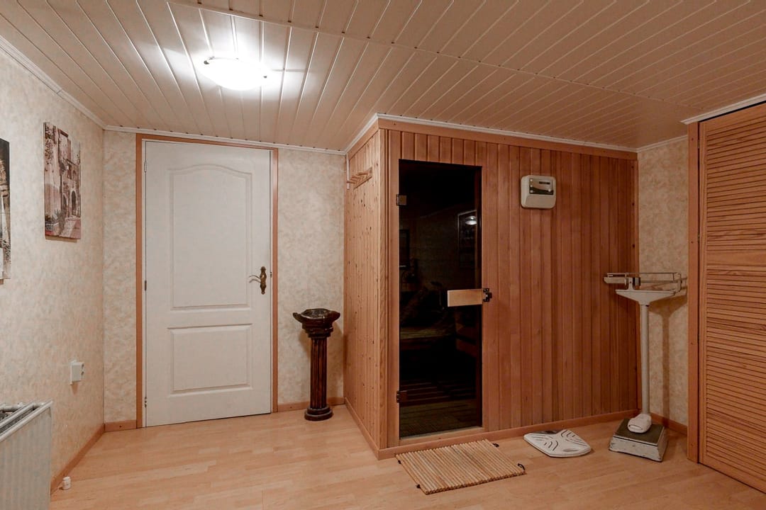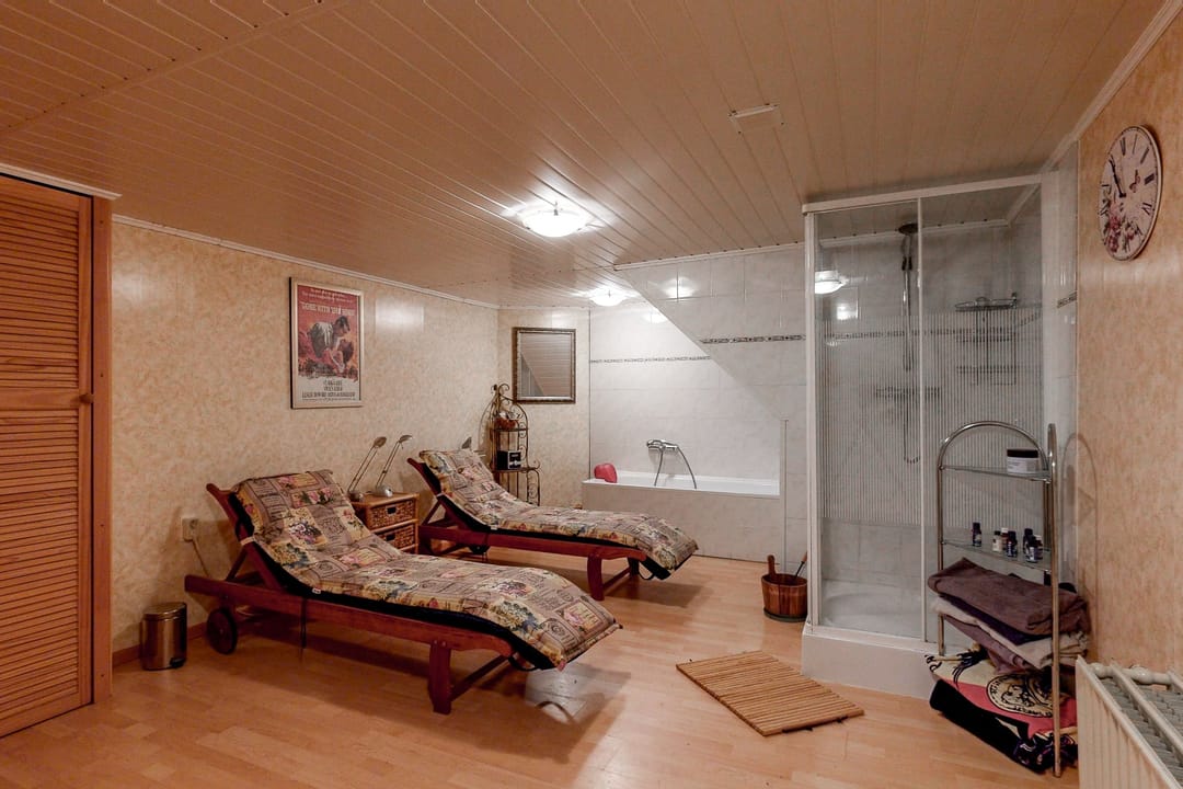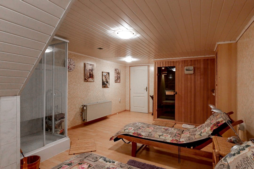 - Wellnessruimte met sauna, ligbad en douche.