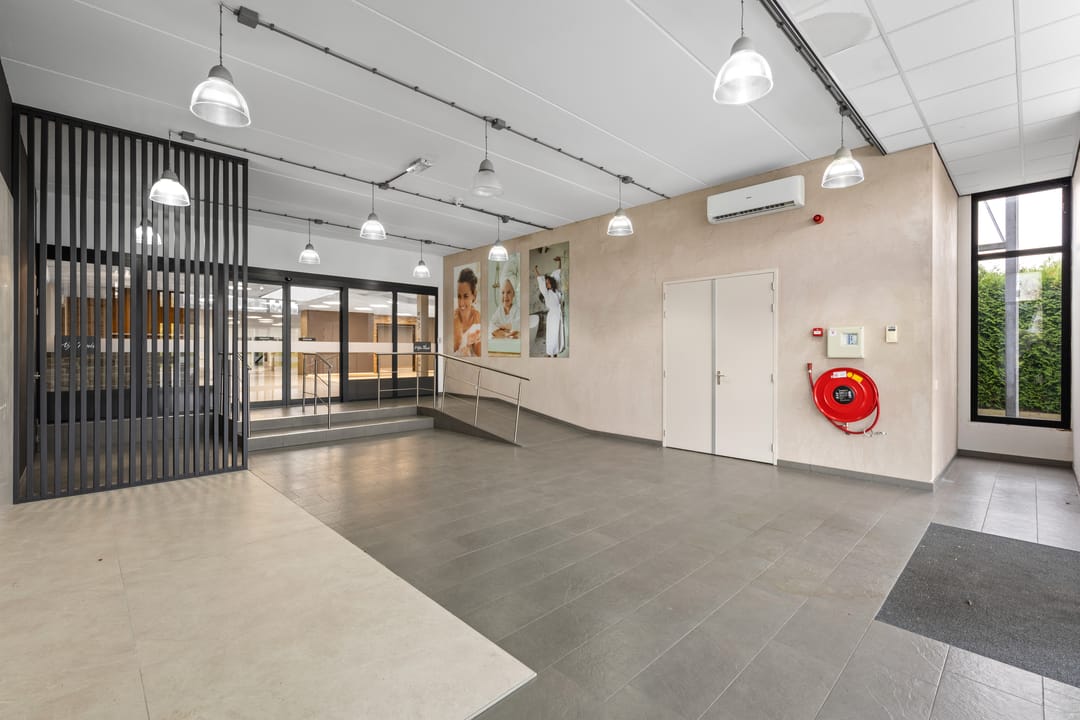 Representatieve entree/showroom met automatische toegangsdeur en aangrenzende technische ruimte.