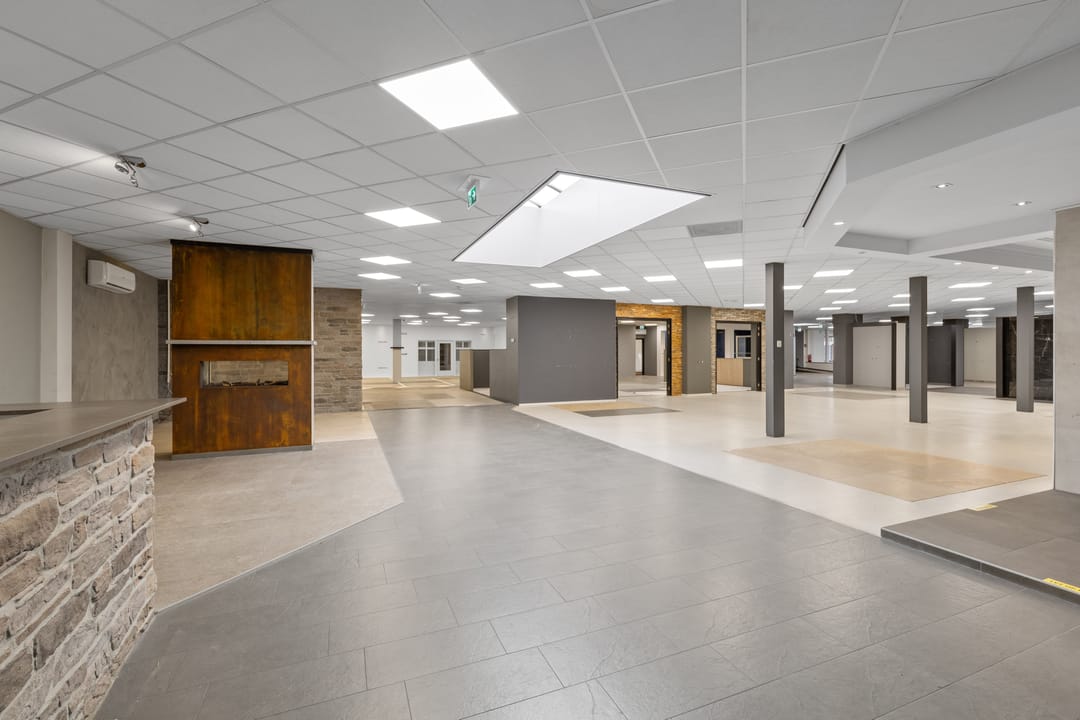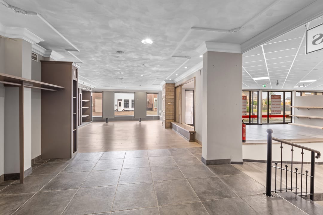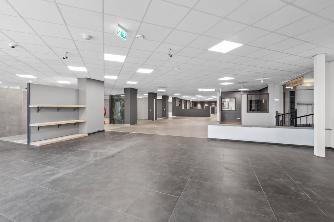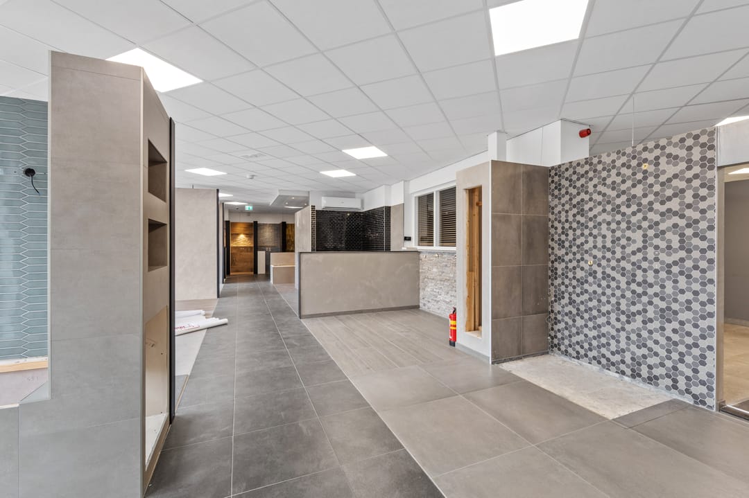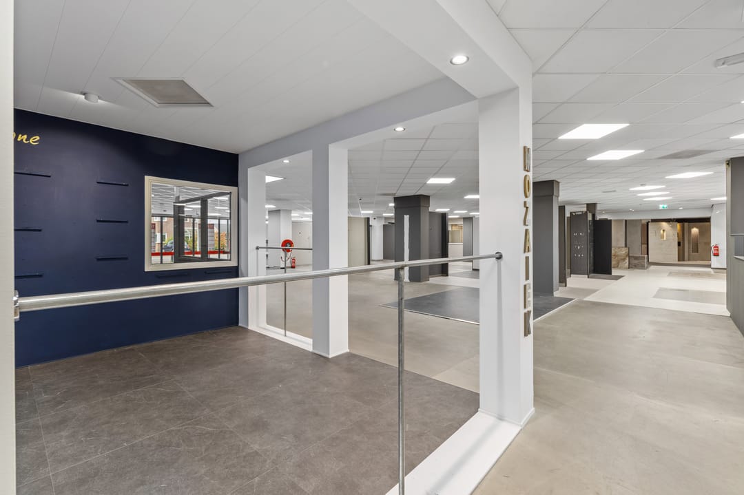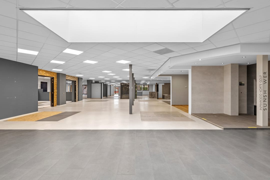 Ruime showroom voorzien van tegelvloeren, spachtelputz wandafwerking, systeemplafonds, nooduitgang, receptie, kinderhoek en uitgebreide toiletgroep (heren-, dames- en invalidentoilet).