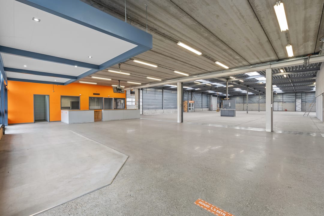 Opslag-/verkoopruimte ten behoeve van groothandel met betonvloer en glaspui.