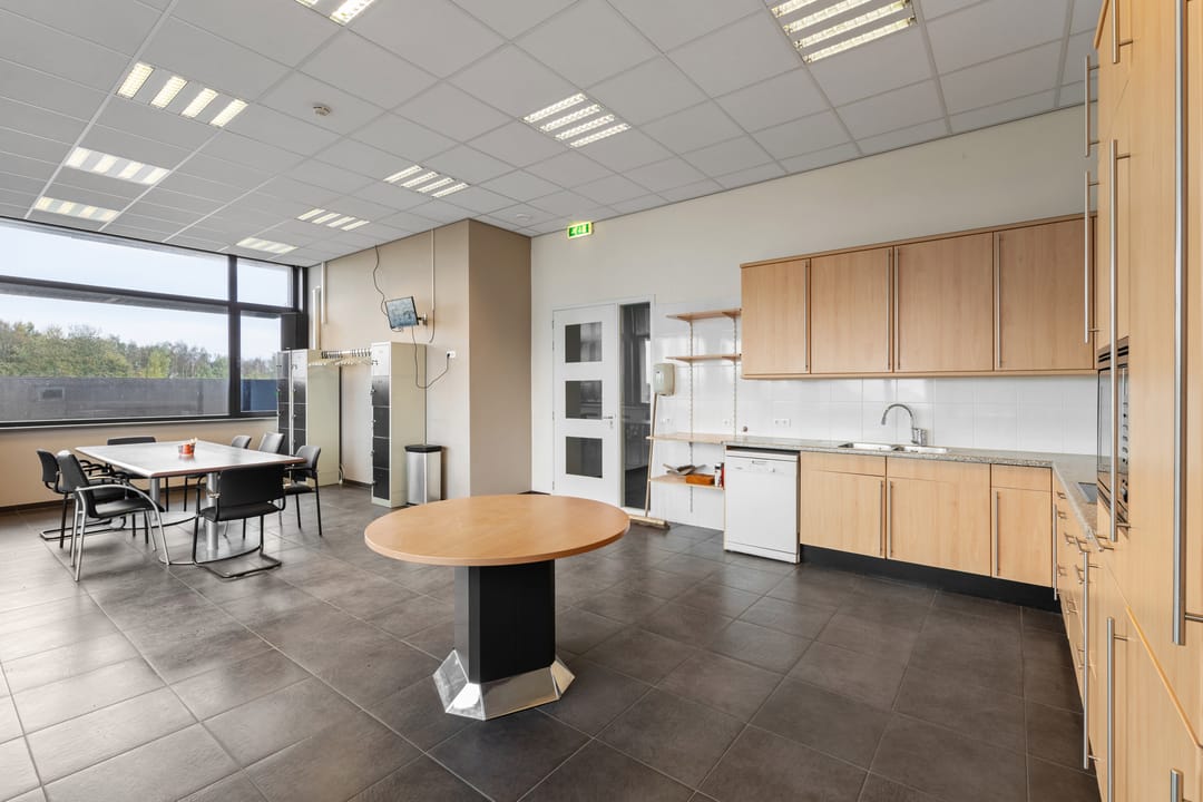 Kantine met keukenblok (keramische kookplaat, afzuigkap, magnetron, koelkast) en toegang tot dakterras