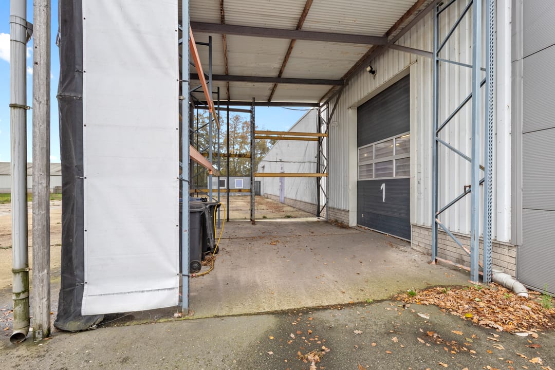 Opslagruimte met betonvloer, staalconstructie, gemetselde borstwering, damwandprofielen, luchtheaters, overheaddeur, loopdeur, dubbele deuren en aangrenzende luifel.