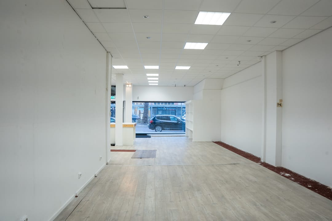 BG: representatief winkelpand met een frontbreedte van bijna 9 meter. Binnen is de winkel ruim 10 meter breed en ruim 18 meter diep. Enkele jaren geleden is de gehele gevel (dus ook van de bovenwoningen) geheel gerenoveerd. Gelegen in een winkelstrip die is voorzien van een nette glazen overkapping. Ook bij regen loopt het winkelend publiek dus droog. De winkel omvat voornamelijk winkelruimte, uiteraard ontbreken een toilet, een pantry en een kantoortje (17m2) niet. Vanuit het kantoor bereikt u een taartpuntig tuintje van circa 15m2. Deze kan eventueel dienstdoen als rokersplek maar ook als nooduitgang. Achter in de winkel bevinden zich een trap en transportband naar de kelder. De mooie rechthoekige winkelruimte kan naar eigen wens ingedeeld en ingericht kan worden.