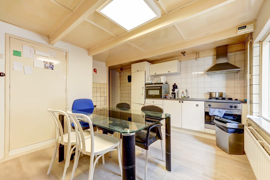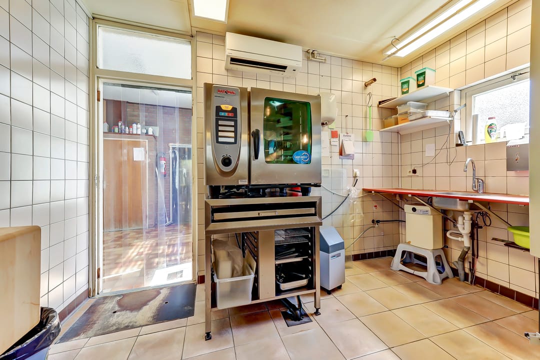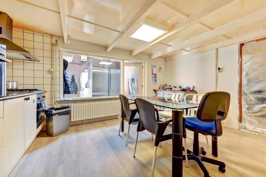 Achter de winkelruimte bevindt zich de woonkeuken, bereikbaar via een hal. Deze keuken is functioneel en praktisch ingericht met witte keukenkastjes, gaskookplaat, afzuigkap, combimagnetron, oven en voldoende werkruimte. Er is plaats voor een eettafel, waardoor het een gezellige leefruimte vormt.