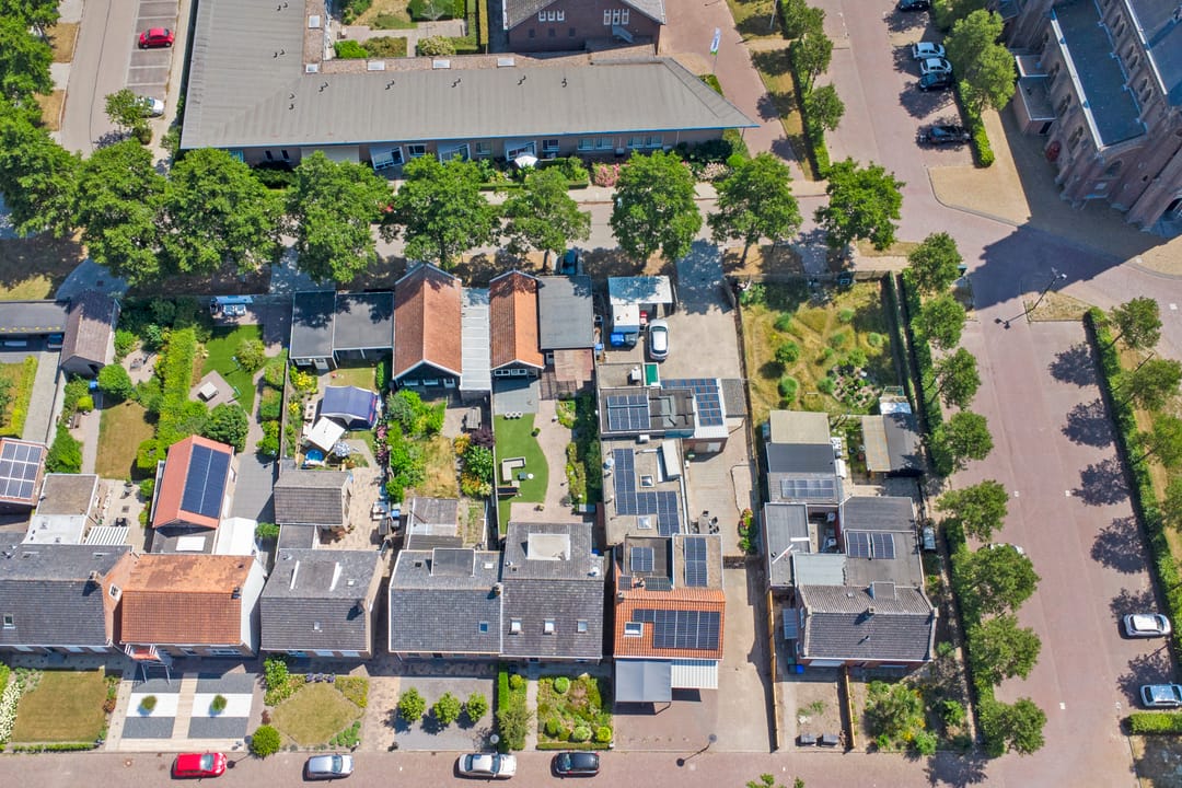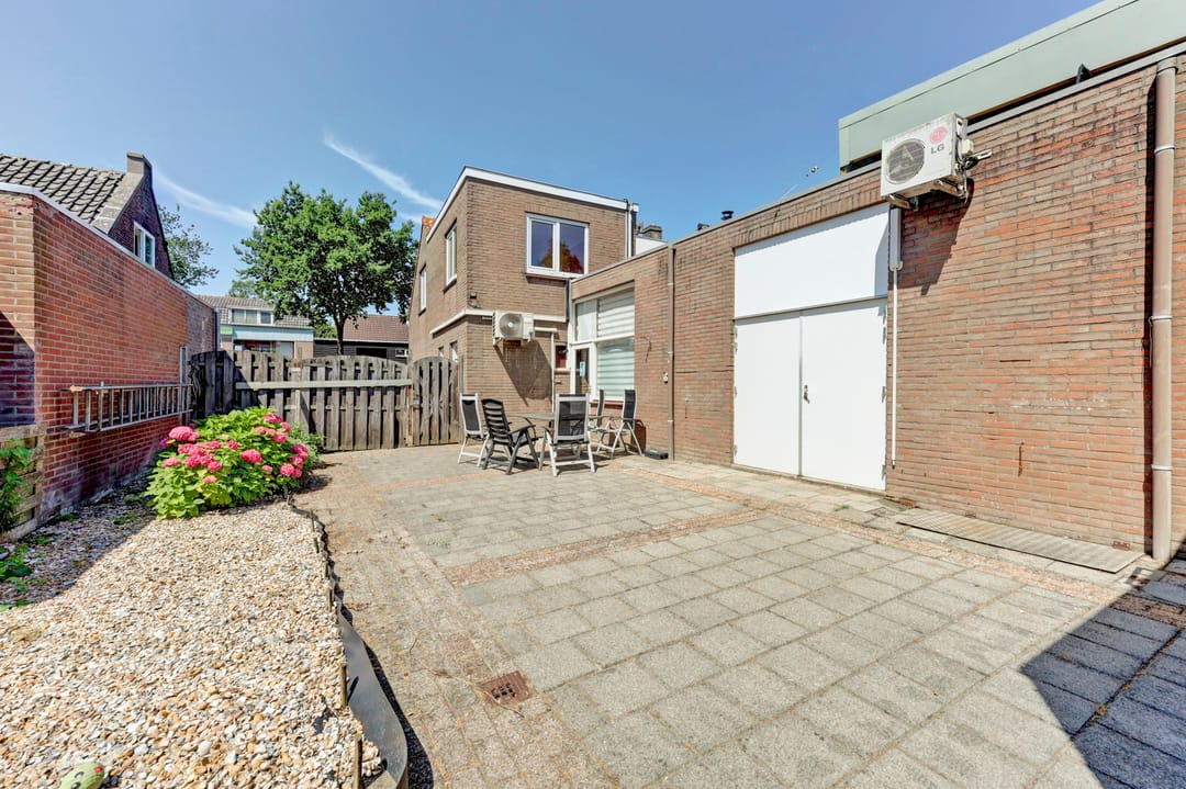 Aan de achterzijde van de woning vindt u een verrassend ruime, onderhoudsvriendelijke tuin. Deze is grotendeels bestraat, met voldoende ruimte voor een groot terras. De tuin is volledig omsloten en biedt veel privacy. Tevens is er een poort met toegang tot een achterpad.
