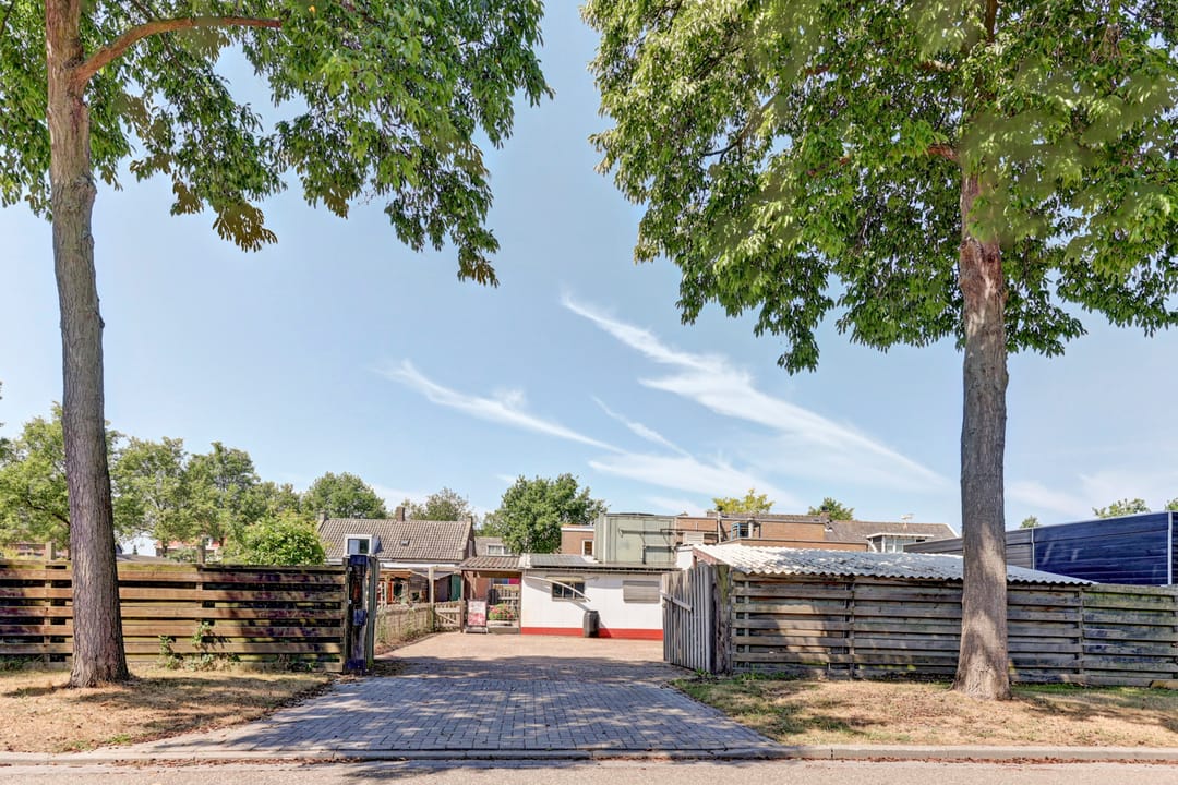 De brede oprit aan de voorzijde van de woning biedt ruimte voor meerdere auto's op eigen terrein.