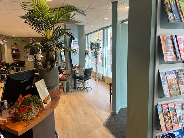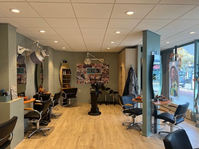 Beg.gr.: entree, een grote ruimte, ingericht als kapperszaak, balie/receptie, keukengedeelte, spoel/wasgedeelte, koffiehoek en wachtruimte.