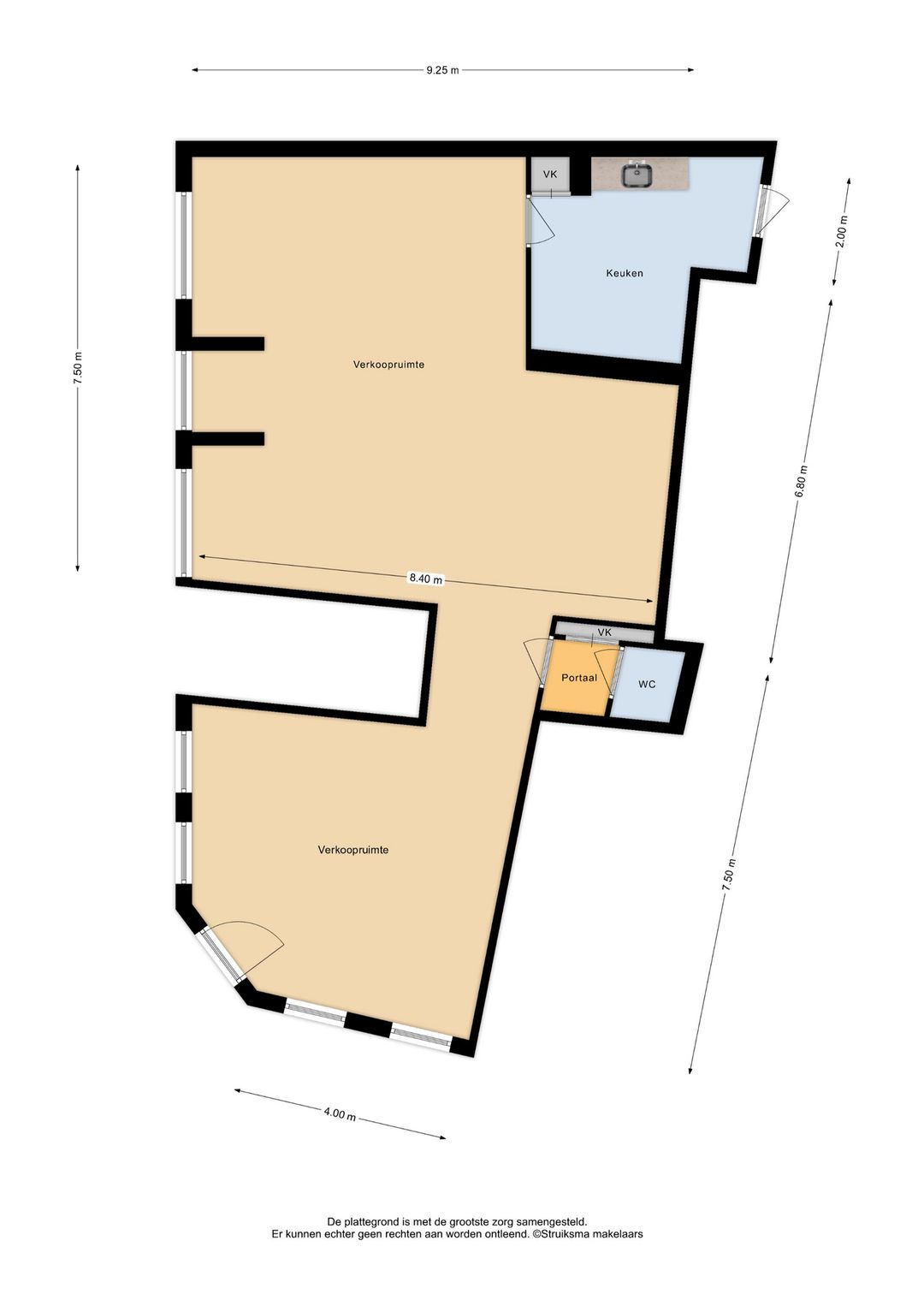 De winkelruimte is voorzien van een parketvloer, systeemplafonds met armaturen, verwarming middels radiatoren. De totale ruimte is ca. 100m2 met inbegrip van een wc met voorportaal en een keuken/kantine met keukenblok. De frontbreedte aan de Marktstraat is ca. 5m en aan de Nauwe Noorderhorne ca. 13m. Veel lichtinval door de vele ramen in de zijgevel van het pand.