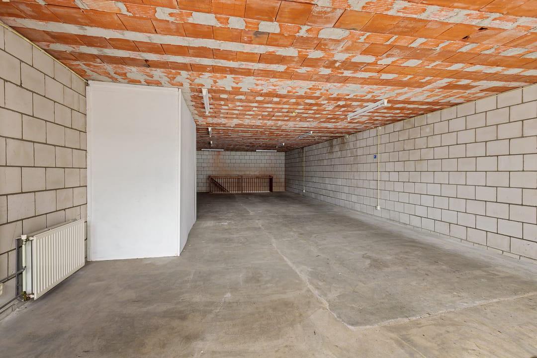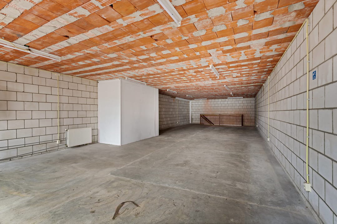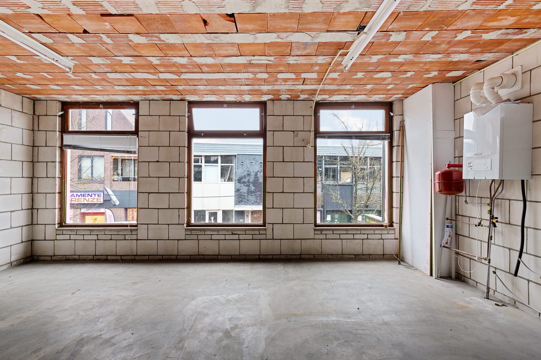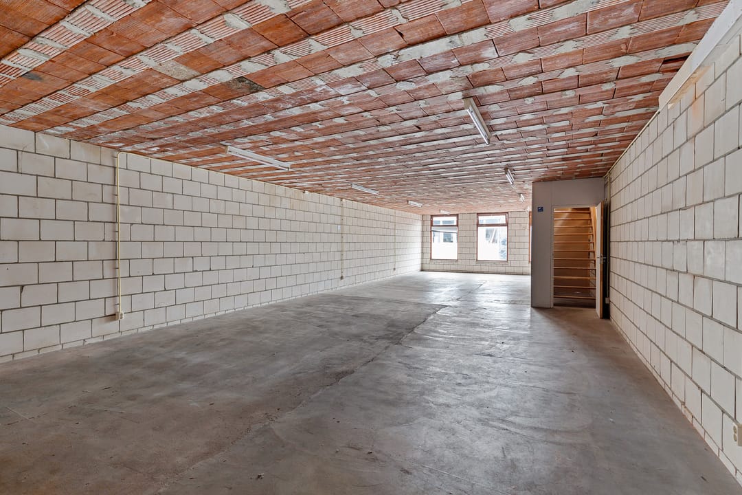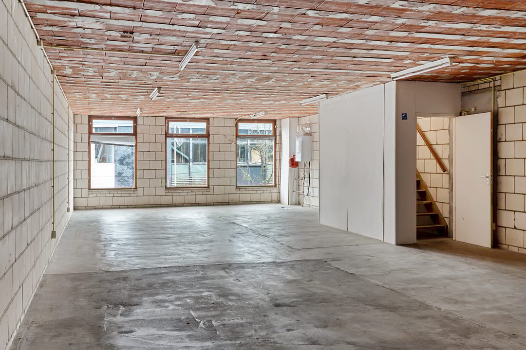 Het pand is momenteel ingericht als casco ruimte, waarbij de dragende constructie, betonnen vloeren en basisindeling duidelijk zichtbaar zijn. Op de begane grond valt direct de open, rechthoekige ruimte op met een vrije hoogte van circa 2,93 meter en een oppervlakte van ongeveer 104 m². Grote raampartijen aan de straatzijde zorgen voor daglichttoetreding en zichtbaarheid, passend bij een commerciële invulling.