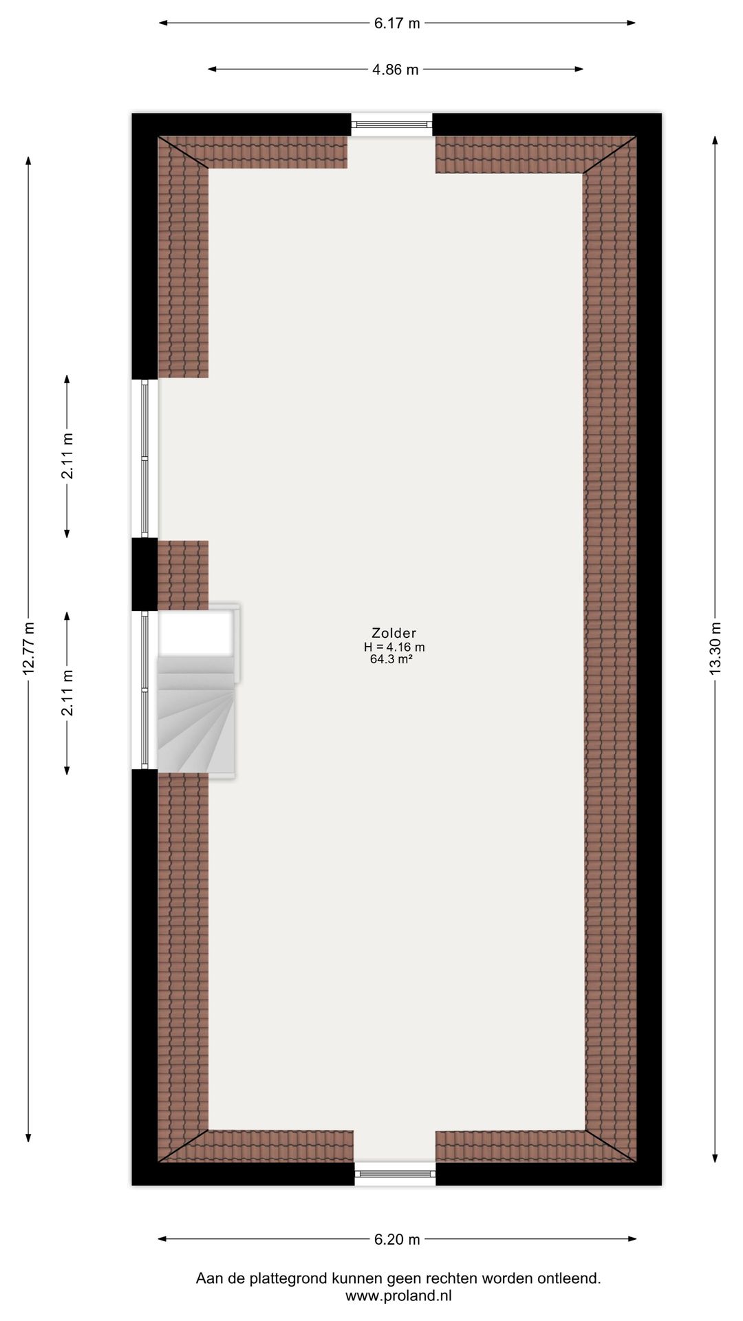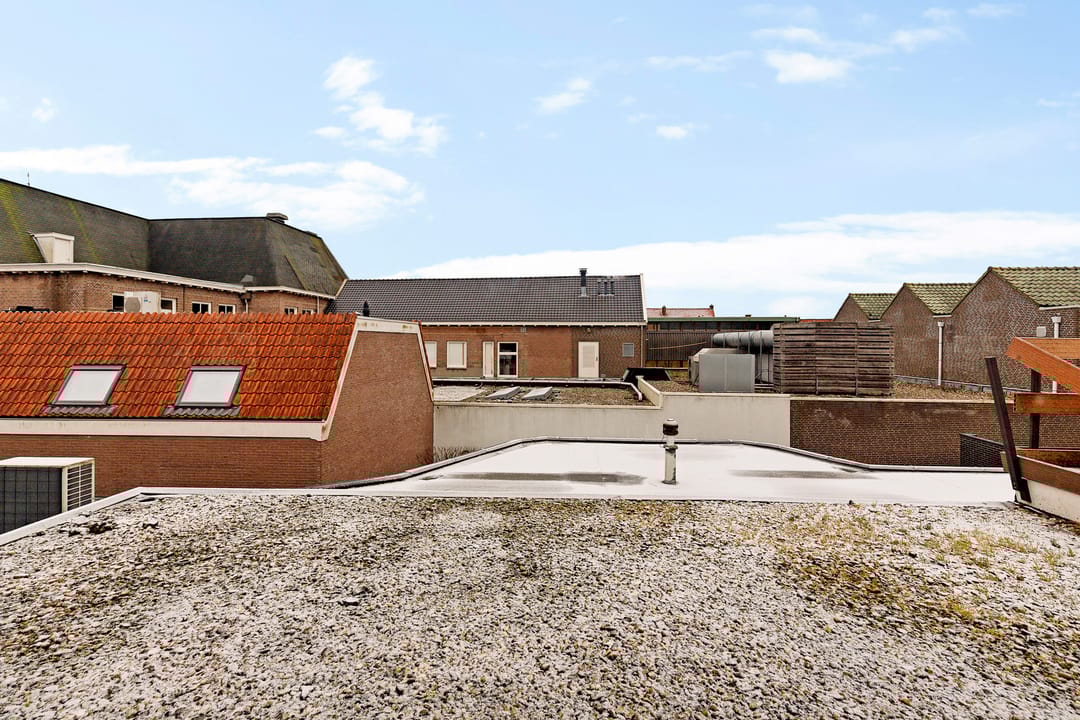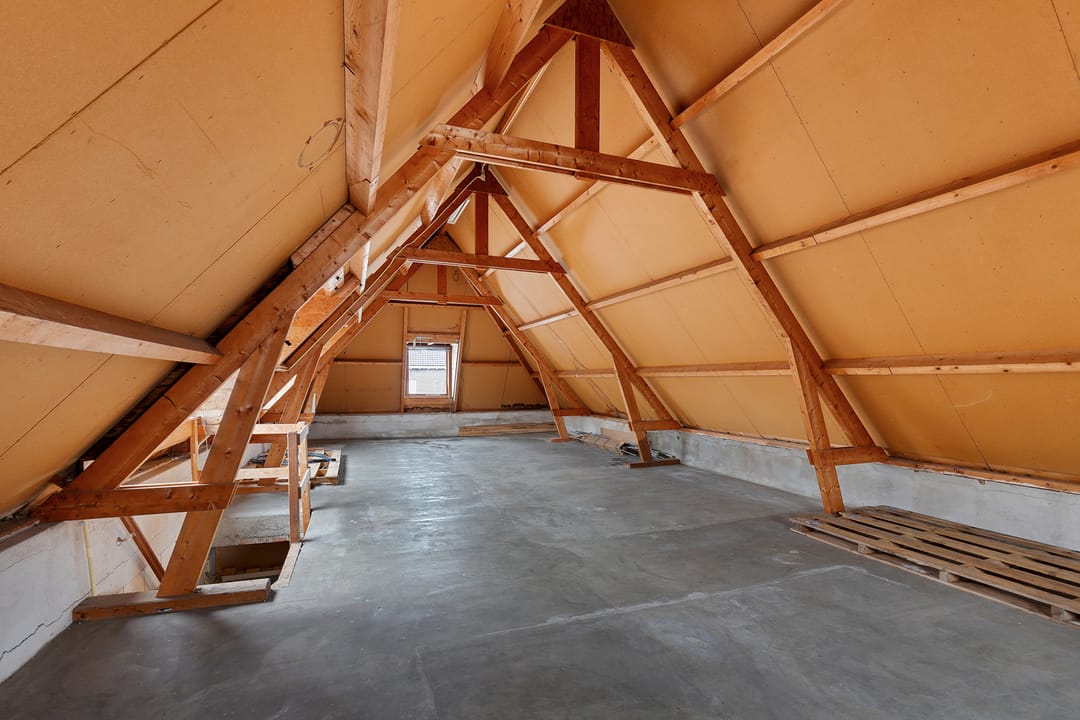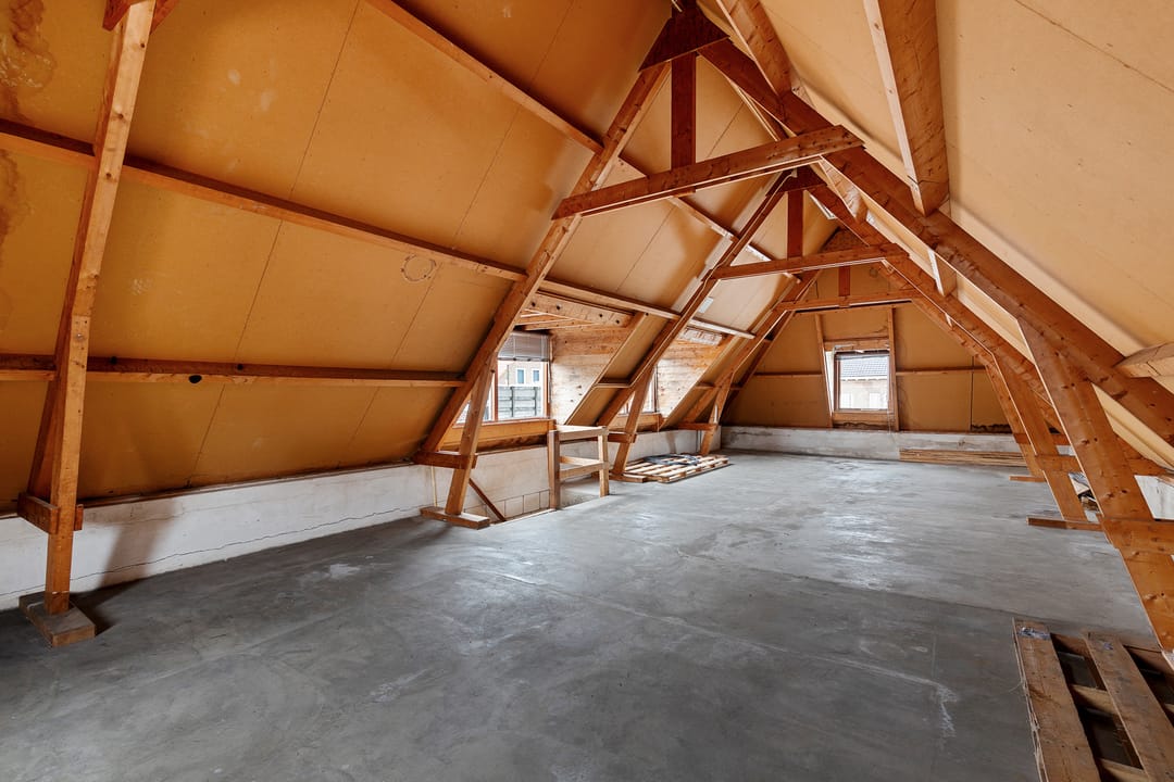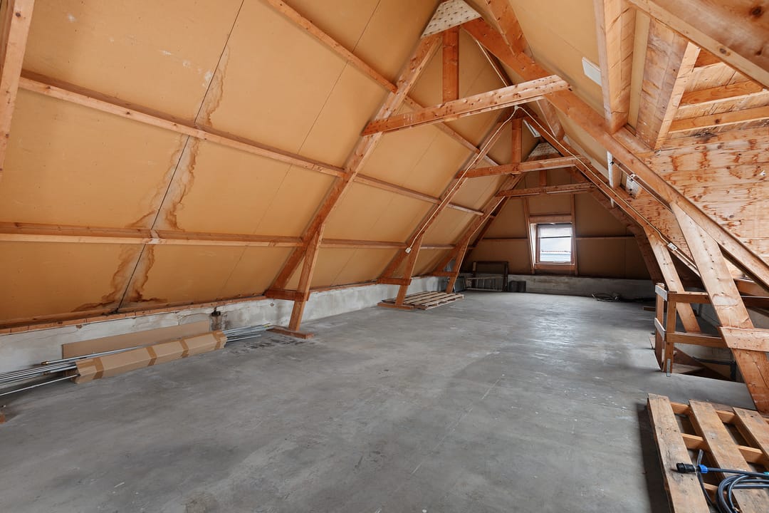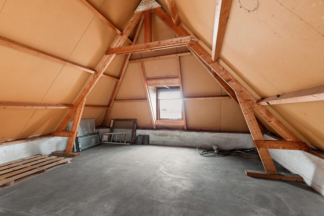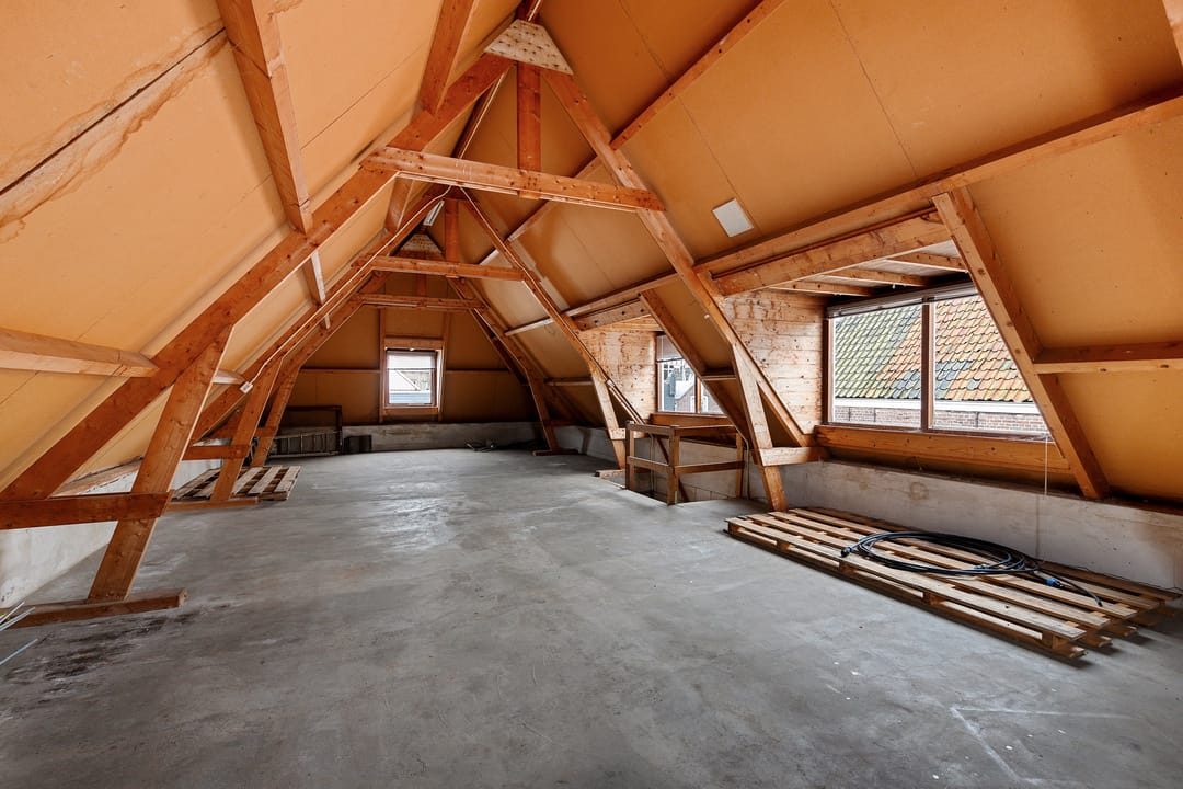 Open zolderverdieping van circa 64,3 m² met zichtbare houten kapconstructie en dakramen. Geschikt voor een appartement, studio of aanvullende woonruimte.