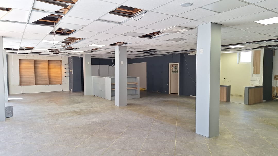 winkelruimte van ca. 183 m², toilet, kantoor met keukenblok en achterdeur.