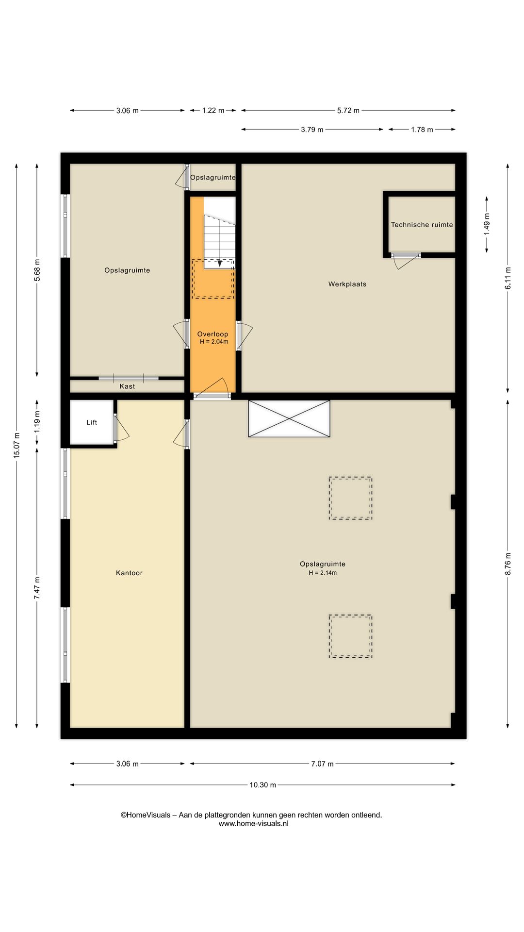 De verdieping beschikt over een overloop met toegang tot de technische ruimte en diverse opslagruimtes. Daarnaast is hier een kantoor gesitueerd.