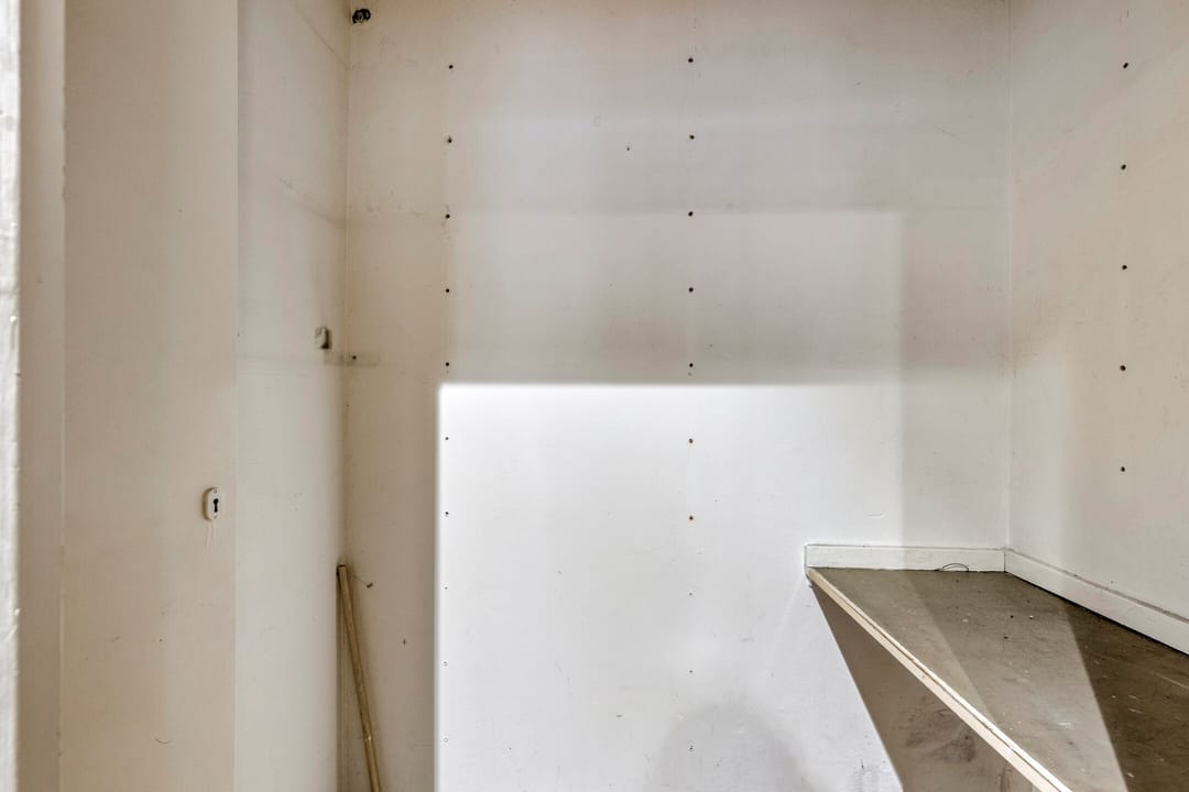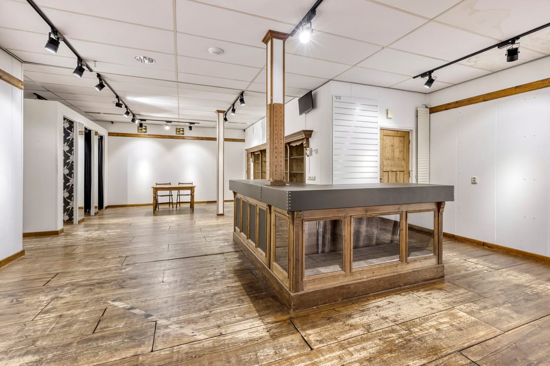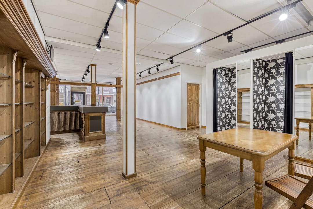 De winkel is een open ruimte met een houten vloer, gestucte wanden en systeem plafond met geplaatste rails met verlichting. De winkel biedt toegang tot de berging, pantry, meterkast en toilet.