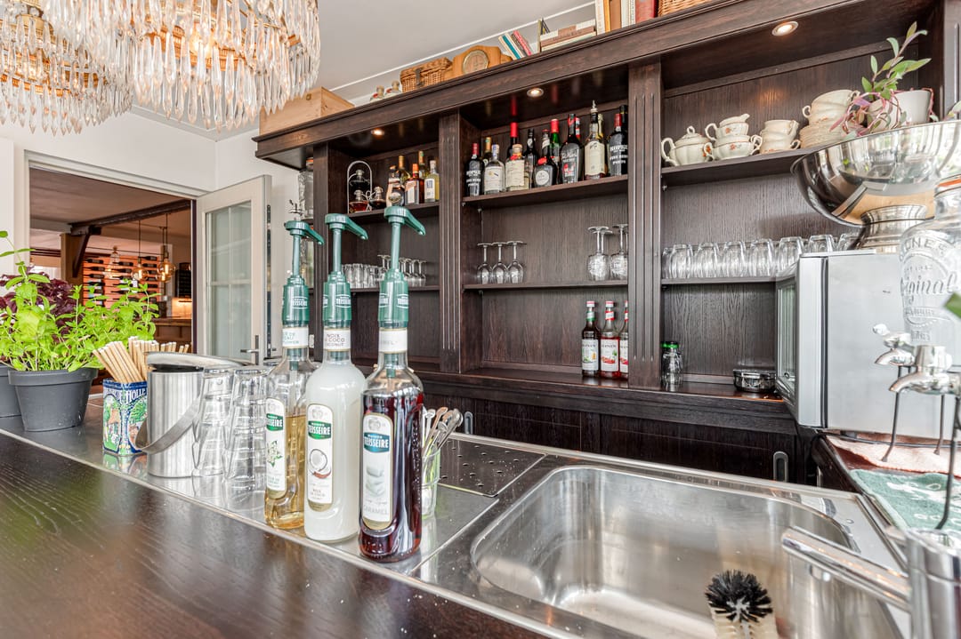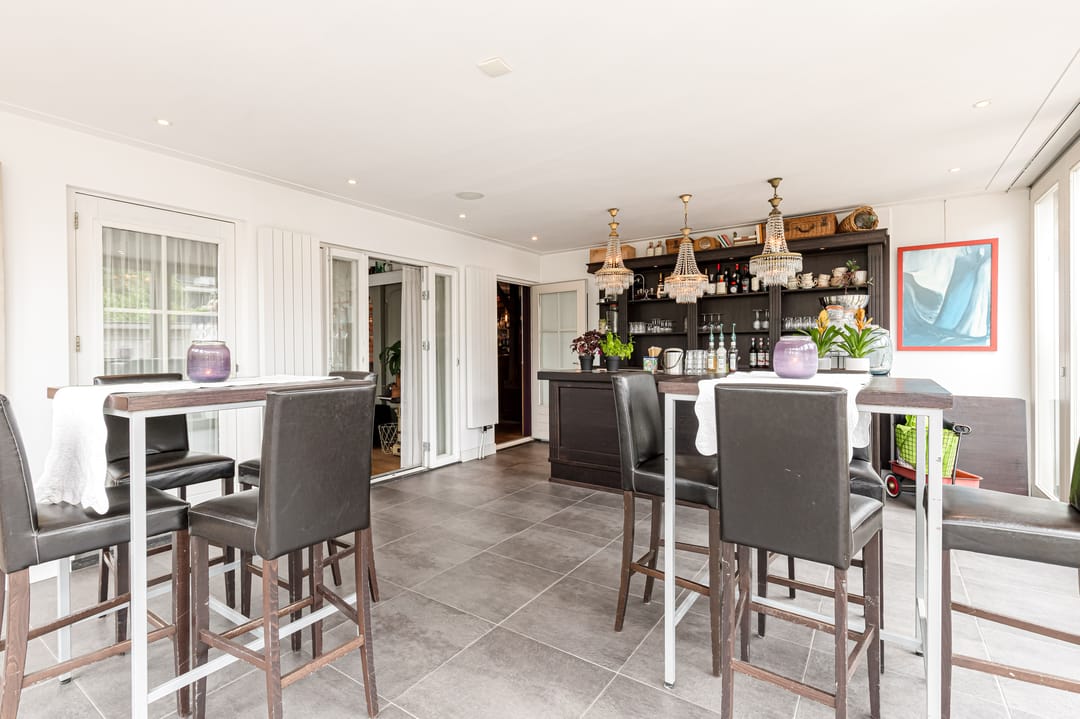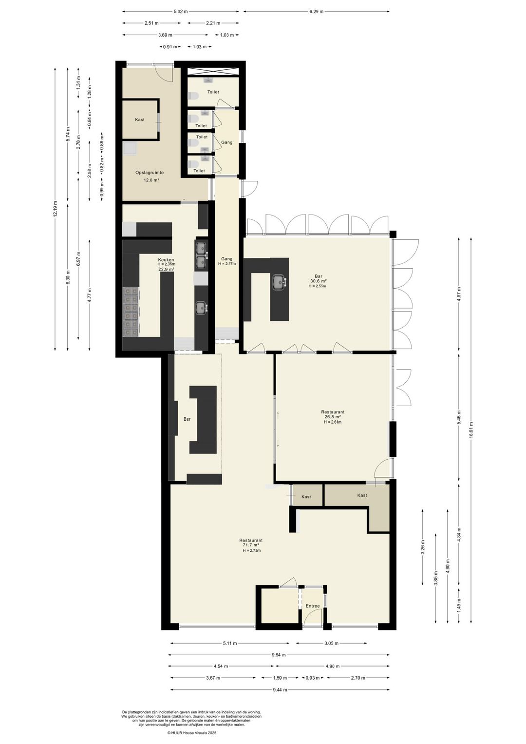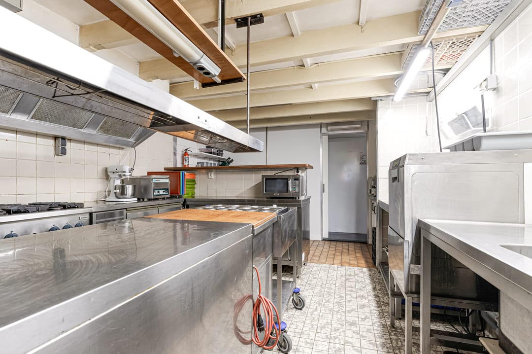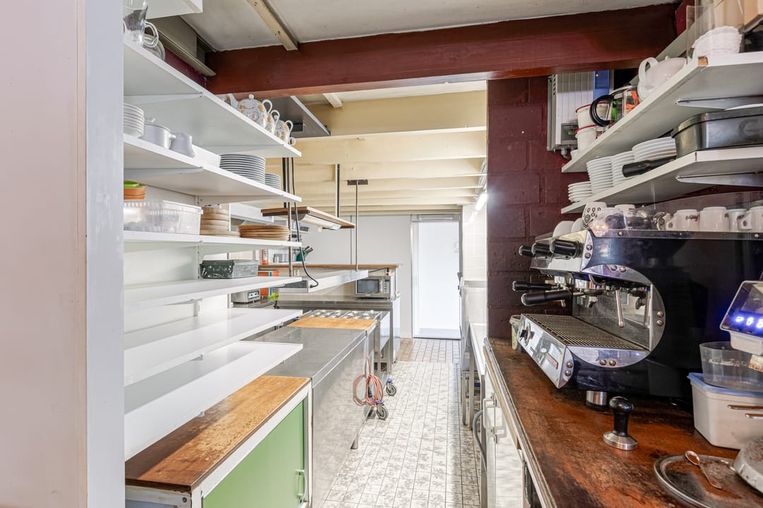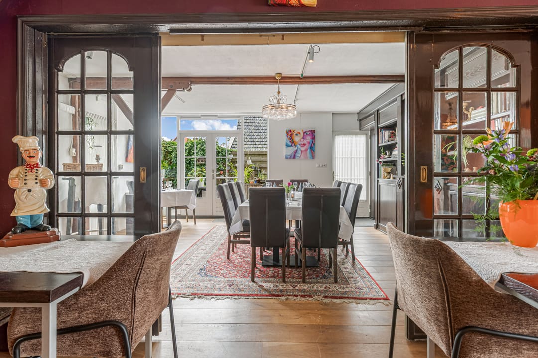 Het bedrijfsdeel bestaat uit meerdere commerciële ruimtes van verschillende afmetingen, momenteel ingericht als restaurant en bar, maar eenvoudig te transformeren naar andere gebruiksdoeleinden. De twee baropstellingen, centraal gesitueerde keuken, diverse opslagruimtes en de complete toiletgroep bieden mogelijkheden voor uiteenlopende bedrijfsactiviteiten. De ruime oppervlakten geven daarbij veel vrijheid in indeling en inrichting.