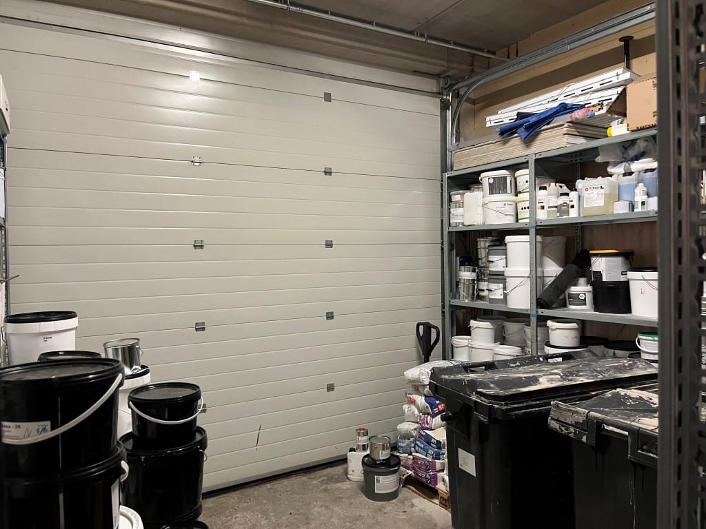 De bedrijfs-/opslagruimte op de begane grond is groot ca. 20 m² en voorzien van een elektrisch bedienbare overheaddeur