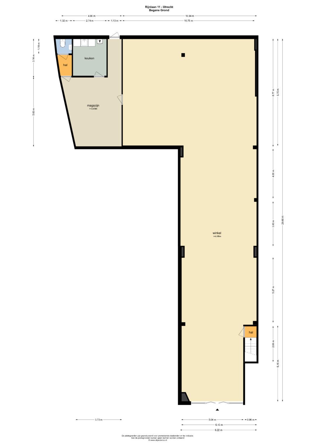 In het totaal is de ruimte 291 m² v.v.o. groot met een frontbreedte van circa 5 meter. Het grootste deel daarvan bevindt zich op de begane grond, een klein gedeelte is gelegen in de kelder die middels een trap te bereiken is. Aan de achterzijde van de ruimte is een kantoorruimte en een magazijnruimte gesitueerd.