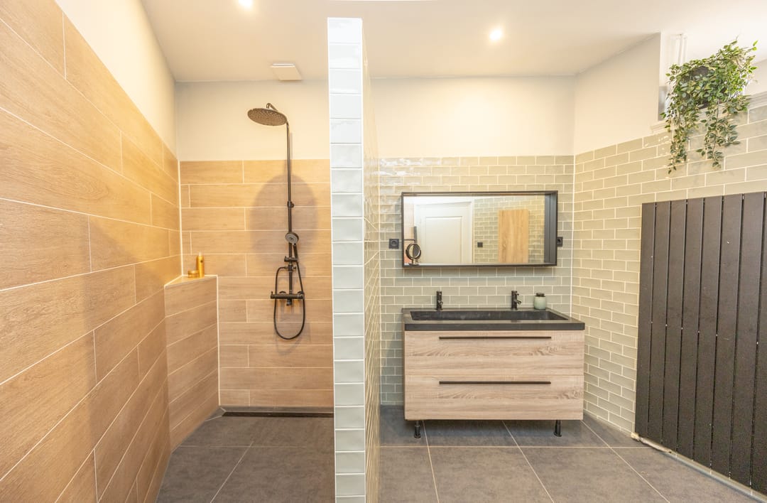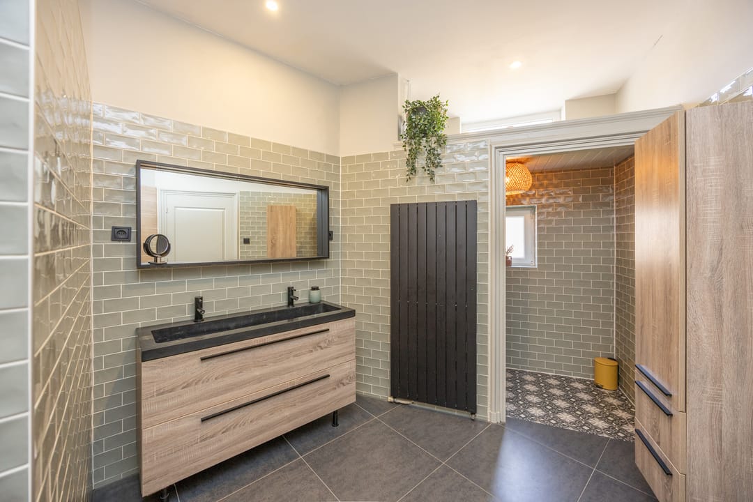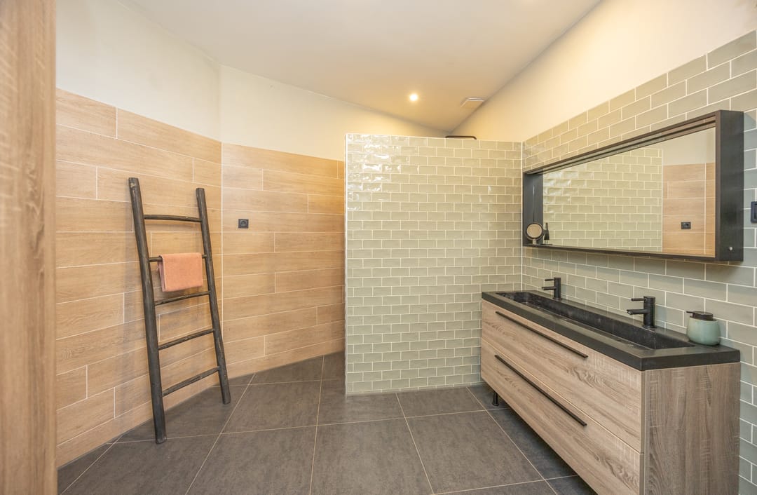 - luxe afgewerkte badkamer welke is ingedeeld met een ruime inloopdouche, een dubbele vaste wastafel verwerkt in een badmeubel, een toilet en een design radiator