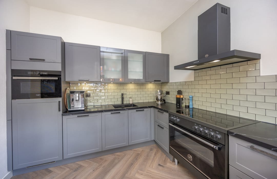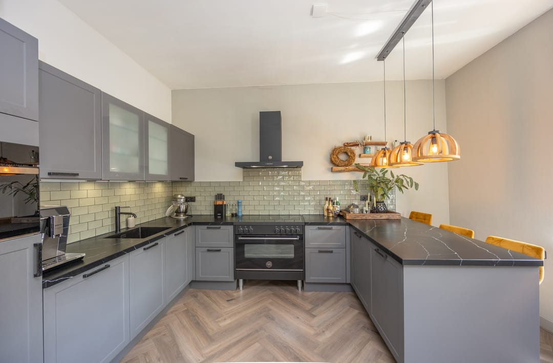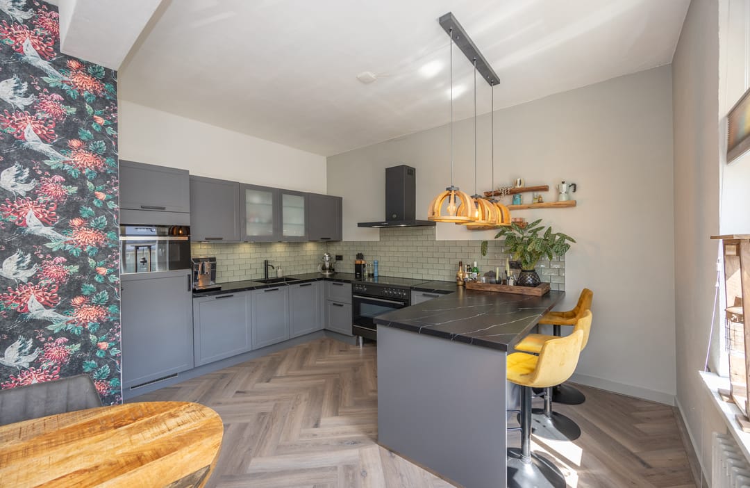 - het woongedeelte (woonkamer met keuken) wat gelegen is aan de voorzijde van de woning. Ook hier is weer goed zichtbaar hoe veel daglicht naar binnen kan komen. De keuken is ruim van opzet en ingericht met een moderne keukeninstallatie. De diverse inbouwapparatuur zijn een afzuiging, een inductie-fornuis met oven, een koelkast, een combi-magnetron en een vaatwasser. Doordat de installatie in U-vorm is opgesteld is er tevens een zitgedeelte gecreëerd voor de snelle hap.
