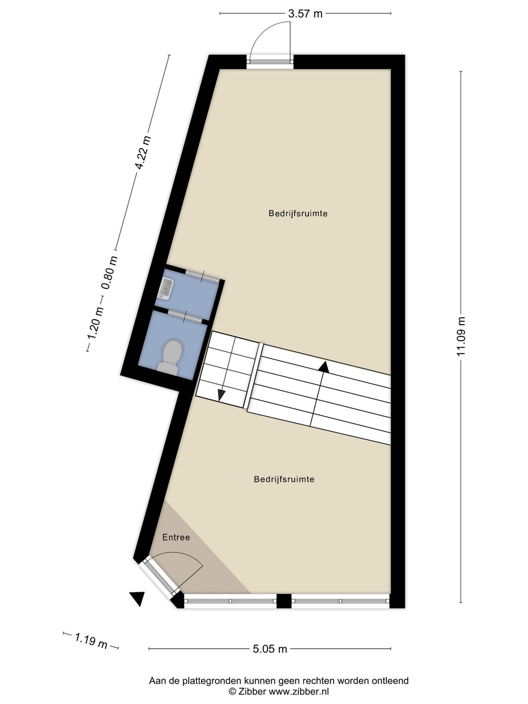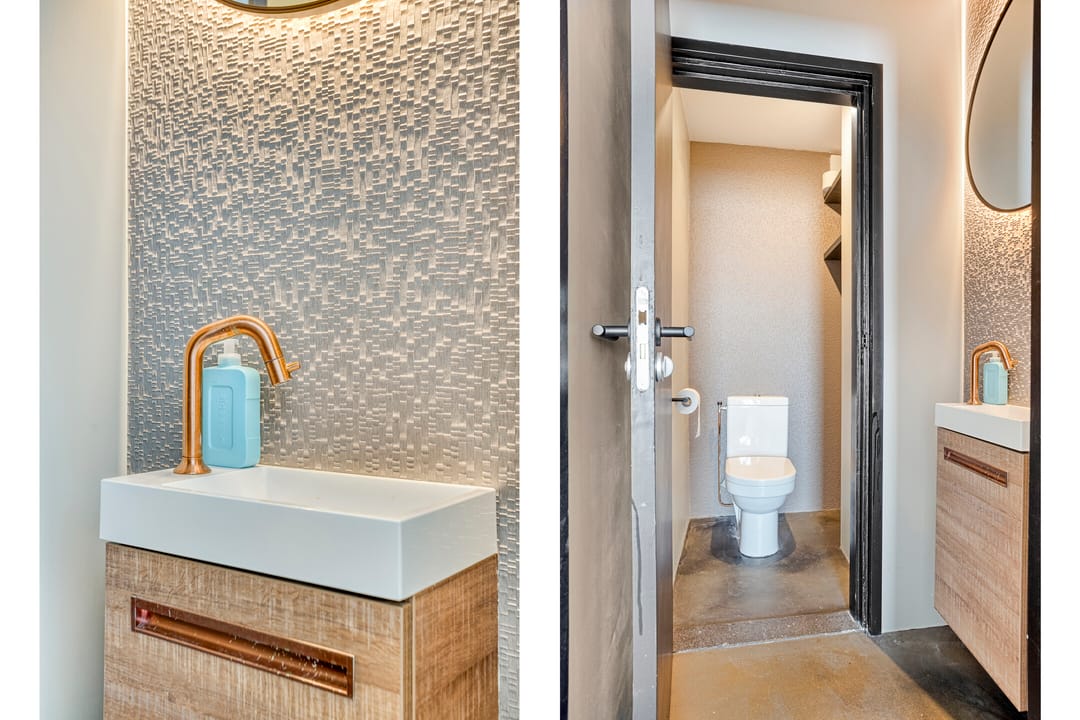 Middels een brede trappartij toegang tot het hoger gelegen niveau. Deze verdieping beschikt over een moderne toiletruimte voorzien van wastafel en achterin een nooduitgang.